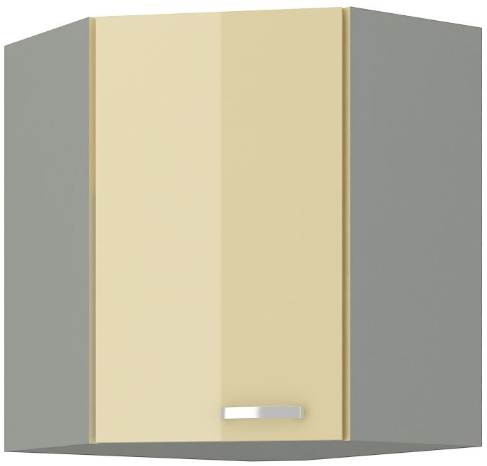 Horní rohová skříňka ze systému CARMEN - rohová skříňka do kuchyňské linky je uzavíratelná praktickými dvířky se širokými úchyty. Dvířka skříněk jsou provedené v moderním krémovém lesku.