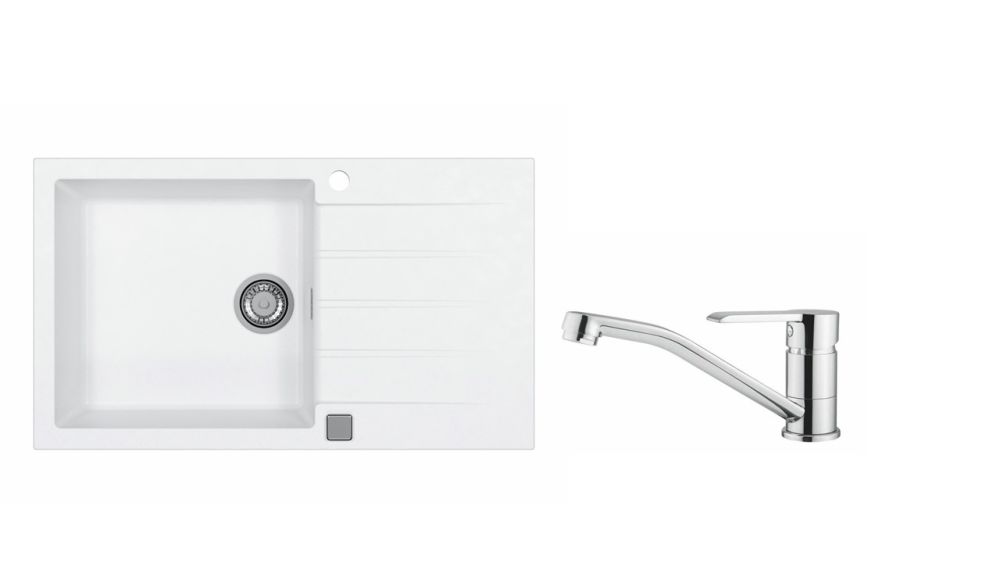 Vestavěný dřez, univerzál. Provedení : granitový dřez s odkapem Vnější rozměr: 860 x 500 mm Rozměr vaničky: 445 x 425 x 200 mm Excentrický sítkový ventil 3 1/2 s přepadem, sifon pro úsporu místa s odbočkou na myčku Úchyty a těsnění pro upevnění dřezu v balení S otvorem pro baterii Návod pro instalaci v obrázcích na obale Instalace do skříňky o šířce 600 mm Váha: 15,2 kg Rozměr balení (mm): 974x598x263 Baterie Ruta Stojánková baterie Otočné ramínko Rozměr: 215x328 mm Provedení chrom