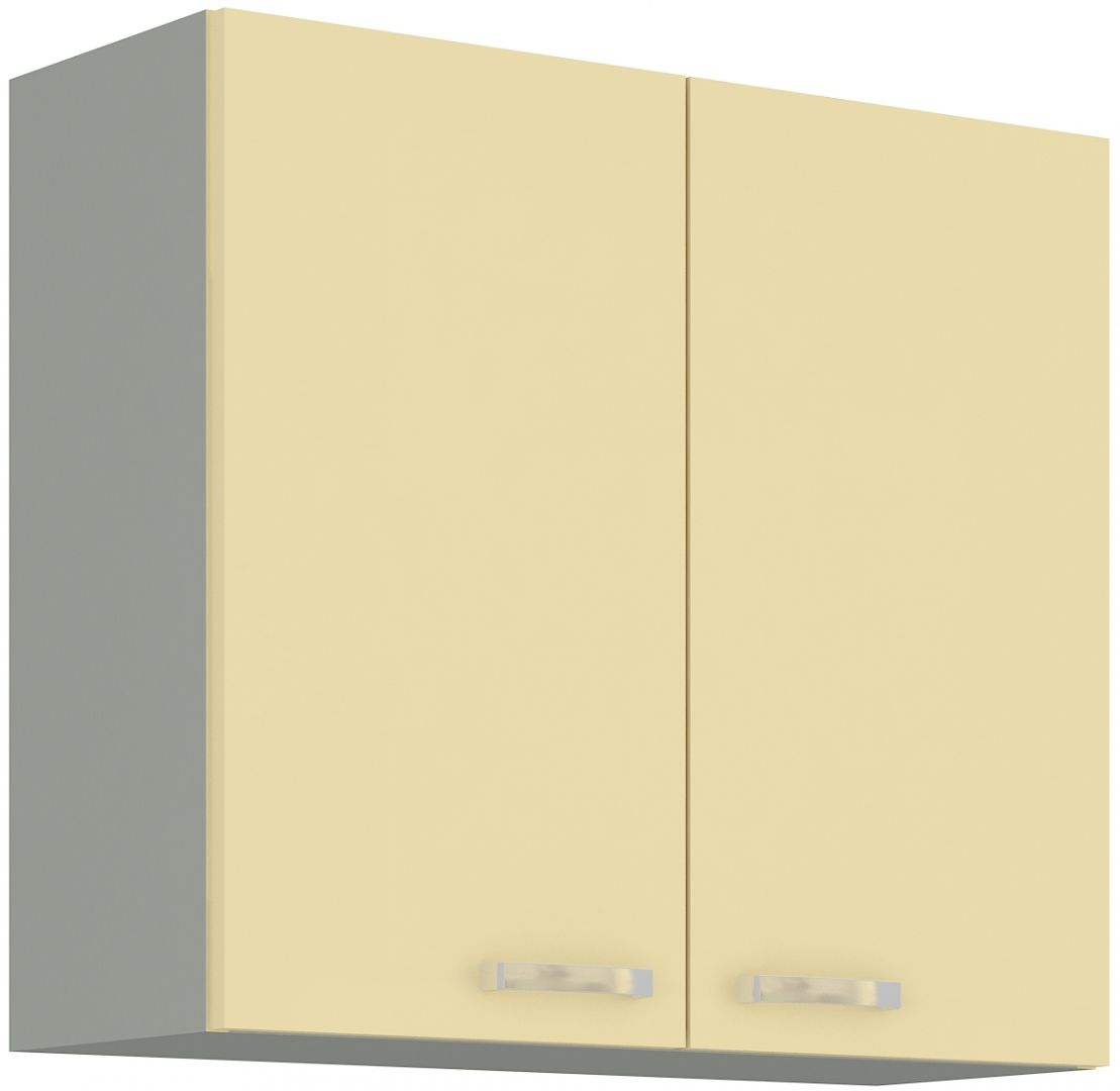 Horní otevírací plná skříňka ze systému CARMEN - skříňka do kuchyňské linky je uzavíratelná praktickými dvířky se širokými úchyty. Dvířka skříněk jsou provedené v moderním krémovém lesku. Dvířka skříňky mají tichý doraz.