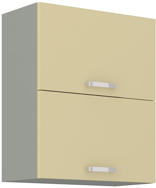 Horní plná výklopná skříňka ze systému CARMEN - skříňka do kuchyňské linky je uzavíratelná praktickými dvířky se širokými úchyty. Dvířka skříněk jsou provedené v moderním krémovém lesku. Dvířka se otevírají pomocí plynových pístů.
