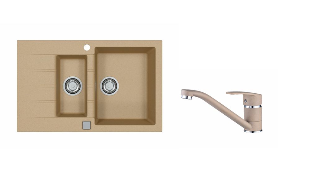 Vestavěný dřez, univerzál. Provedení : granitový dřez s odkapem Vnější rozměr: 790 x 500 mm Rozměr vaničky: 330 x 425 x 200 mm Rozměr vaničky: 170 x 340 x 140 mm Exentrický sítkový ventil 3 1/2 s přepadem, sifon pro úsporu místa s odbočkou na myčku Úchyty a těsnění pro upevnění dřezu v balení S otvorem pro baterii Návod pro instalaci v obrázcích na obale Instalace do skříňky o šířce 600 mm Váha: 15,6 kg Rozměry balení (mm): 904x598x263 Baterie Nina Vysokotlaká baterie otočné ramínko rozměr:237 x 120 mm provedení: barevný nástřik