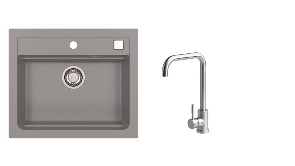 Vestavěný dřez, univerzál. Provedení : granitový dřez s odkapem Vnější rozměr: 590 x 500 mm Rozměr vaničky: 510 x 340 x 195 mm Exentrický sítkový ventil 3 1/2 s přepadem, sifon pro úsporu místa s odbočkou na myčku Úchyty a těsnění pro upevnění dřezu v balení S otvorem pro baterii Předfrézované dva otvory Návod pro instalaci v obrázcích na obale Instalace do skříňky při montáži: I- o šířce 600 mm, U- o šířce 800 mm Váha: 11,7 kg Rozměry balení (mm): 714x598x263 Baterie Angel Stojánková baterie Otočné ramínko Rozměr: 215x342 mm Provedení chrom