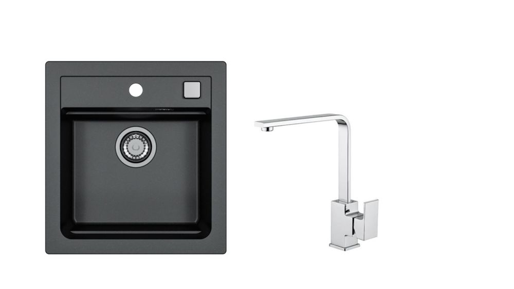 Vestavěný dřez, univerzál. Provedení : granitový dřez s odkapem Vnější rozměr: 470 x 500 mm Rozměr vaničky: 390 x 340 x 195 mm Exentrický sítkový ventil 3 1/2 s přepadem, sifon pro úsporu místa s odbočkou na myčku Úchyty a těsnění pro upevnění dřezu v balení S otvorem pro baterii Předfrézované dva otvory Návod pro instalaci v obrázcích na obale Instalace do skříňky při montáži: I- o šířce 450 mm, U- o šířce 600 mm Váha: 9,7 kg Rozměry balení (mm): 598x584x263 Baterie Reno Stojánková baterie Otočné ramínko Rozměr: 207x286 mm Provedení chrom
