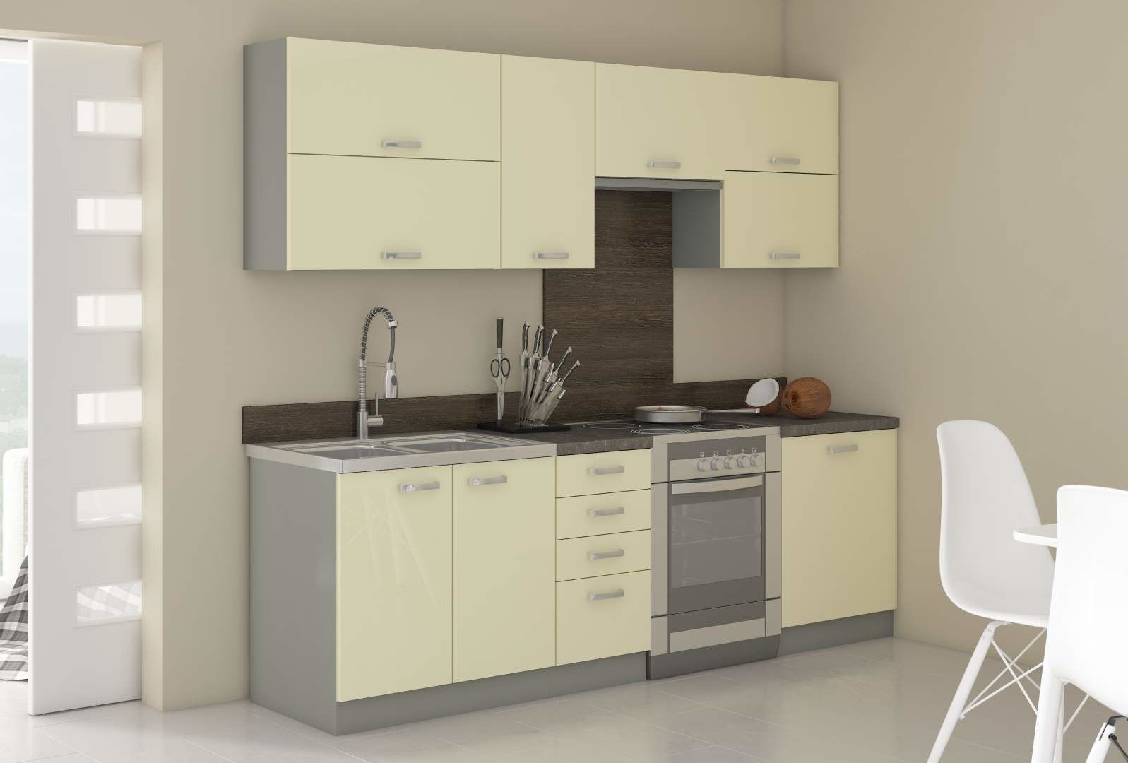 Moderní kuchyňská linka v barevném provedení korpus šedý / dvířka krémový lesk. Kuchyňská linka má atraktivní moderní vzhled je tak ideální volbou pro Vaši kuchyni. Dvířka kuchyňských skříněk nebo šuplíků mají tiché zavírání dvířek. U skříněk s výklopem se dvířka zvedají pomocí plynových pístů. V ceně kuchyňské linky jsou kovové úchyty. U šuplíků velikosti 60 a 80 cm jsou boky šuplíků kovové. Skříňky kuchyňské linky jsou opatřeny tichým dorazem.