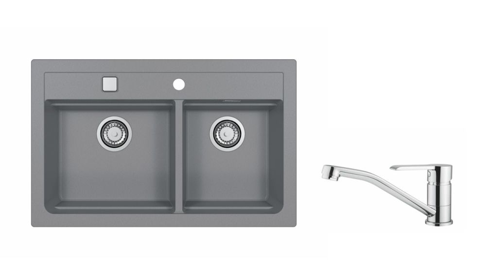 Vestavěný dřez, univerzál. Provedení : granitový dřez s odkapem Vnější rozměr: 790 x 500 mm Rozměr vaničky: 390 x 340 x 195 mm 300 x 340 x 145 mm Exentrický sítkový ventil 3 1/2 s přepadem, sifon pro úsporu místa s odbočkou na myčku Úchyty a těsnění pro upevnění dřezu v balení S otvorem pro baterii Předfrézované tři otvory Návod pro instalaci v obrázcích na obale Instalace do skříňky při montáži: I- o šířce 800 mm, U- o šířce 900 mm Váha: 17,5 kg Rozměry balení (mm): 904x598x263 Baterie Ruta Stojánková baterie Otočné ramínko Rozměr: 215x328 mm Provedení chrom