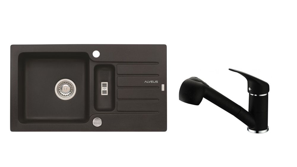 Vestavěný dřez, univerzál. Provedení : granitový dřez s odkapem Vnější rozměr: 780 x 435 mm Rozměr vaničky: 348x350x160 mm 100x225x70 mm Exentický sítkový ventil 3 1/2 s přepadem, sifon pro úsporu místa s odbočkou na myčku Úchyty a těsnění pro upevnění dřezu v balení S otvorem pro baterii Návod pro instalaci v obrázcích na obale Instalace do skříňky o šířce 600 mm Váha: 13,65 kg Rozměr balení (mm):864x560x220 Baterie AM 20 Vysokotlaká baterie otočné ramínko vytahovací sprška rozměr:198 x 150 mm provedení: barevný nástřik