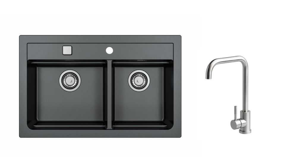Vestavěný dřez, univerzál. Provedení : granitový dřez s odkapem Vnější rozměr: 790 x 500 mm Rozměr vaničky: 390 x 340 x 195 mm 300 x 340 x 145 mm Exentrický sítkový ventil 3 1/2 s přepadem, sifon pro úsporu místa s odbočkou na myčku Úchyty a těsnění pro upevnění dřezu v balení S otvorem pro baterii Předfrézované tři otvory Návod pro instalaci v obrázcích na obale Instalace do skříňky při montáži: I- o šířce 800 mm, U- o šířce 900 mm Váha: 17,5 kg Rozměry balení (mm): 904x598x263 Baterie Angel Stojánková baterie Otočné ramínko Rozměr: 215x342 mm Provedení chrom