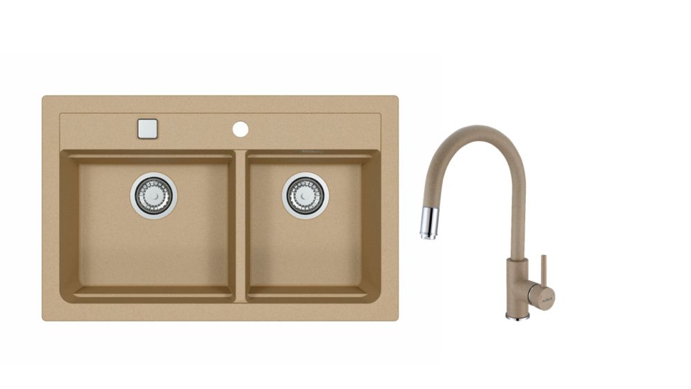Vestavěný dřez, univerzál. Provedení : granitový dřez Vnější rozměr: 790 x 500 mm Rozměr vaničky: 390 x 340 x 195 mm 300 x 340 x 145 mm Exentrický sítkový ventil 3 1/2 s přepadem, sifon pro úsporu místa s odbočkou na myčku Úchyty a těsnění pro upevnění dřezu v balení S otvorem pro baterii Předfrézované tři otvory Návod pro instalaci v obrázcích na obale Instalace do skříňky při montáži: I- o šířce 800 mm, U- o šířce 900 mm Váha: 17,5 kg Rozměry balení (mm): 904x598x263 Vysokotlaká baterie otočné ramínko vytahovací sprška rozměr:207 x 380 mm provedení: barevný nástřik