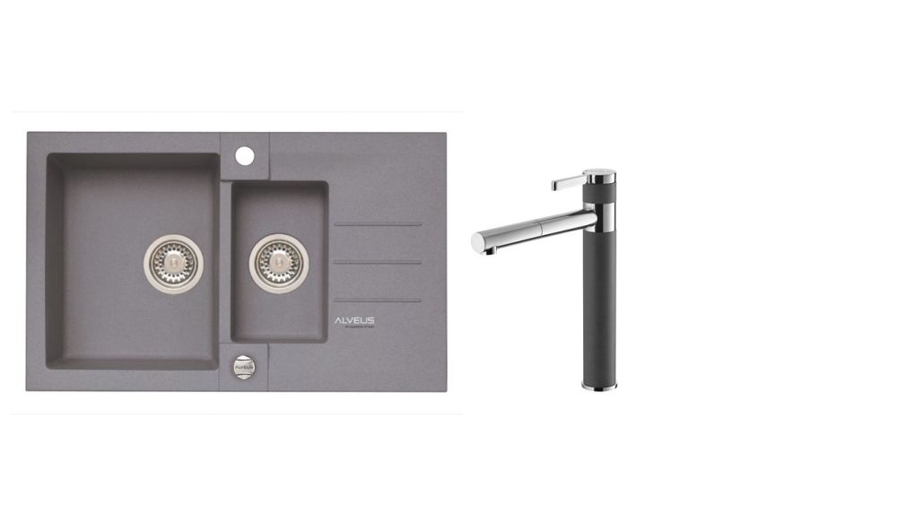 Vestavěný dřez, univerzál. Provedení : granitový dřez s odkapem Vnější rozměr: 780 x 480 mm Rozměr vaničky: 320 x 400 x 180 mm 180 x 300 x 120 mm Exentrický sítkový ventil 3 1/2 s přepadem, sifon pro úsporu místa s odbočkou na myčku Úchyty a těsnění pro upevnění dřezu v balení S otvorem pro baterii Návod pro instalaci v obrázcích na obale Instalace do skříňky o šířce 600 mm Váha: 17,45 kg Rozměr balení (mm): 865x560x220 ZINA Vysokotlaká baterie otočné ramínko rozměr:199 x 298 mm provedení: chrom/barevný nástřik