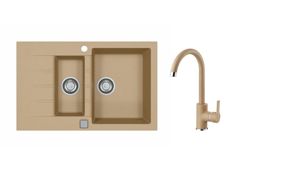 Vestavěný dřez, univerzál. Provedení : granitový dřez s odkapem Vnější rozměr: 790 x 500 mm Rozměr vaničky: 330 x 425 x 200 mm Rozměr vaničky: 170 x 340 x 140 mm Exentrický sítkový ventil 3 1/2 s přepadem, sifon pro úsporu místa s odbočkou na myčku Úchyty a těsnění pro upevnění dřezu v balení S otvorem pro baterii Návod pro instalaci v obrázcích na obale Instalace do skříňky o šířce 600 mm Váha: 15,6 kg Rozměry balení (mm): 904x598x263 Baterie Tonia Vysokotlaká baterie otočné ramínko rozměr:214 x 331 mm provedení:chrom/ barevný nástřik Granital Váha: 1,15 Kg