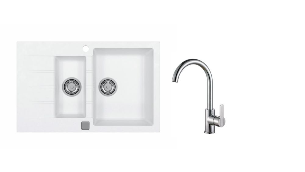 Vestavěný dřez, univerzál. Provedení : granitový dřez s odkapem Vnější rozměr: 790 x 500 mm Rozměr vaničky: 330 x 425 x 200 mm Rozměr vaničky: 170 x 340 x 140 mm Exentrický sítkový ventil 3 1/2 s přepadem, sifon pro úsporu místa s odbočkou na myčku Úchyty a těsnění pro upevnění dřezu v balení S otvorem pro baterii Návod pro instalaci v obrázcích na obale Instalace do skříňky o šířce 600 mm Váha: 15,6 kg Rozměry balení (mm): 904x598x263 Baterie Tonia Chrom Materiál: CHROM Vysokotlaká, otočná Rozměry: 174x320 mm Váha: 1,15 Kg