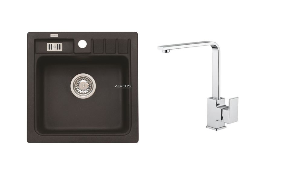 Vestavěný dřez, univerzál. Provedení : granitový dřez Vnější rozměr: 465 x 465 mm Rozměr vaničky: 380x320x180 mm sítkový ventil 3 1/2 s přepadem, sifon pro úsporu místa s odbočkou na myčku Úchyty a těsnění pro upevnění dřezu v balení S otvorem pro baterii Návod pro instalaci v obrázcích na obale Instalace do skříňky o šířce 450 mm Váha: 10,63 kg Rozměr balení (mm): 655x560x267 Baterie RENO Stojánková baterie Otočné ramínko Rozměr: 207x286 mm Provední chrom