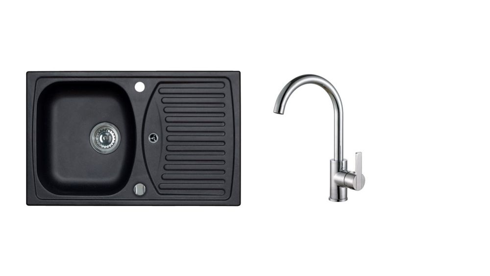 Vestavěný dřez, univerzál. Provedení : granitový dřez s odkapem Vnější rozměr: 780 x 480 mm Rozměr vaničky: 359 x 399 x 160 mm Exentrický sítkový ventil 3 1/2 s přepadem, sifon pro úsporu místa s odbočkou na myčku Úchyty a těsnění pro upevnění dřezu v balení S otvorem pro baterii Návod pro instalaci v obrázcích na obale Instalace do skříňky o šířce 500 mm Váha: 12,25 kg Rozměr balení (mm): 865x560x230 Baterie Tonia Vysokotlaká baterie otočné ramínko rozměr:214 x 331 mm provedení:chrom