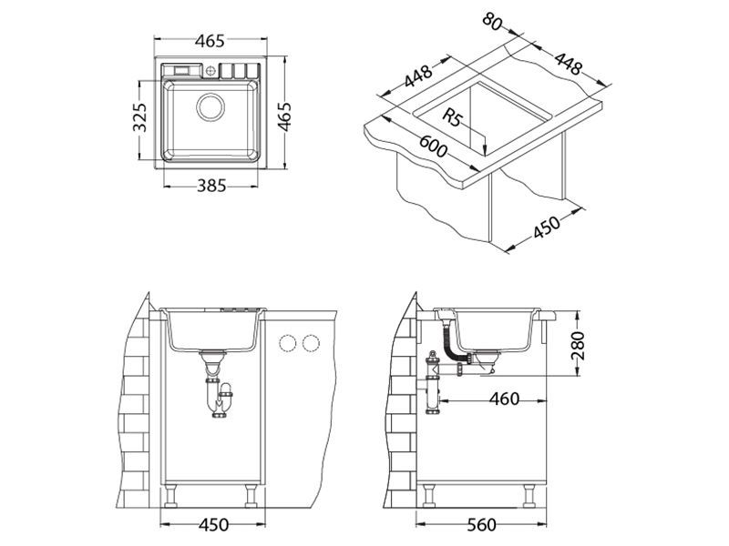 sítkový ventil 3 1/2 s přepadem, sifon pro úsporu místa s odbočkou na myčku