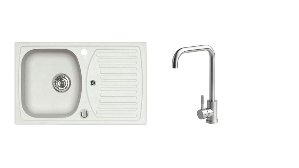 Vestavěný dřez, univerzál. Provedení : granitový dřez s odkapem Vnější rozměr: 780 x 480 mm Rozměr vaničky: 359 x 399 x 160 mm Exentrický sítkový ventil 3 1/2 s přepadem, sifon pro úsporu místa s odbočkou na myčku Úchyty a těsnění pro upevnění dřezu v balení S otvorem pro baterii Návod pro instalaci v obrázcích na obale Instalace do skříňky o šířce 500 mm Váha: 12,25 kg Rozměr balení (mm): 865x560x230 Baterie Angel Chrom Stojánková baterie Otočné ramínko Rozměr: 215x342 mm Provední chrom