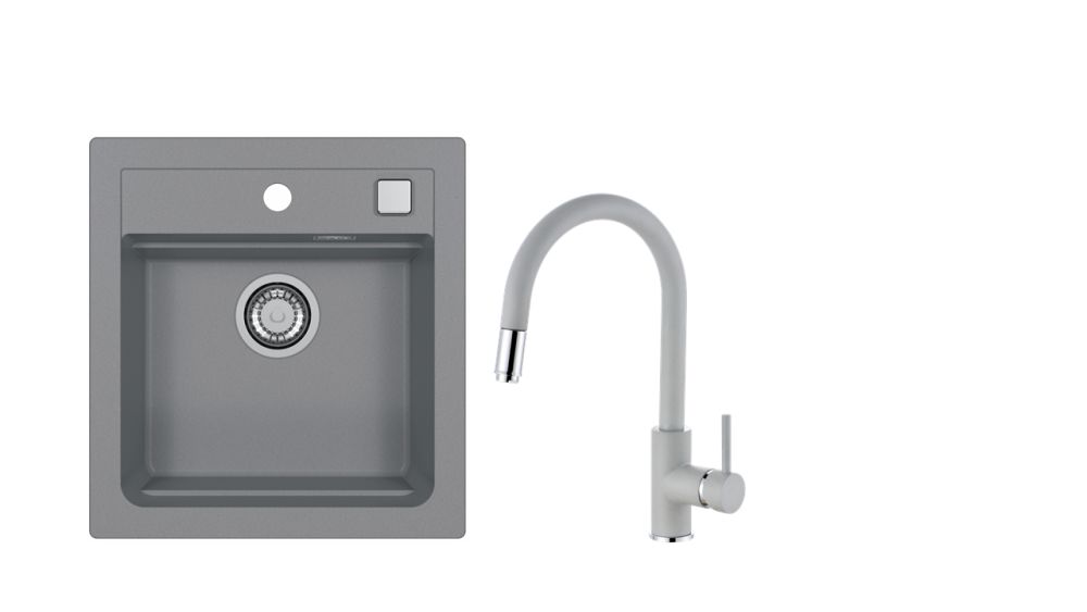 Vestavěný dřez, univerzál. Provedení : granitový dřez Vnější rozměr: 470 x 500 mm Rozměr vaničky: 390 x 340 x 195 mm Exentrický sítkový ventil 3 1/2 s přepadem, sifon pro úsporu místa s odbočkou na myčku Úchyty a těsnění pro upevnění dřezu v balení S otvorem pro baterii Předfrézované dva otvory Návod pro instalaci v obrázcích na obale Instalace do skříňky při montáži: I- o šířce 450 mm, U- o šířce 600 mm Váha: 9,7 kg Rozměr balení (mm): 598x584x263 Vysokotlaká baterie otočné ramínko vytahovací sprška rozměr:207 x 380 mm provedení: barevný nástřik