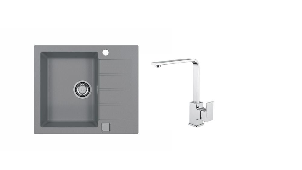 Vestavěný dřez, univerzál. Provedení : granitový dřez s odkapem Vnější rozměr: 590 x 500 mm Rozměr vaničky: 325 x 425 x 200 mm Exentrický sítkový ventil 3 1/2 s přepadem, sifon pro úsporu místa s odbočkou na myčku Úchyty a těsnění pro upevnění dřezu v balení S otvorem pro baterii Návod pro instalaci v obrázcích na obale Instalace do skříňky o šířce 450 mm Váha: 11,5 kg Rozměr balení (mm): 714x598x263 Baterie Reno Stojánková baterie Otočné ramínko Rozměr: 207x286 mm Provedení chrom