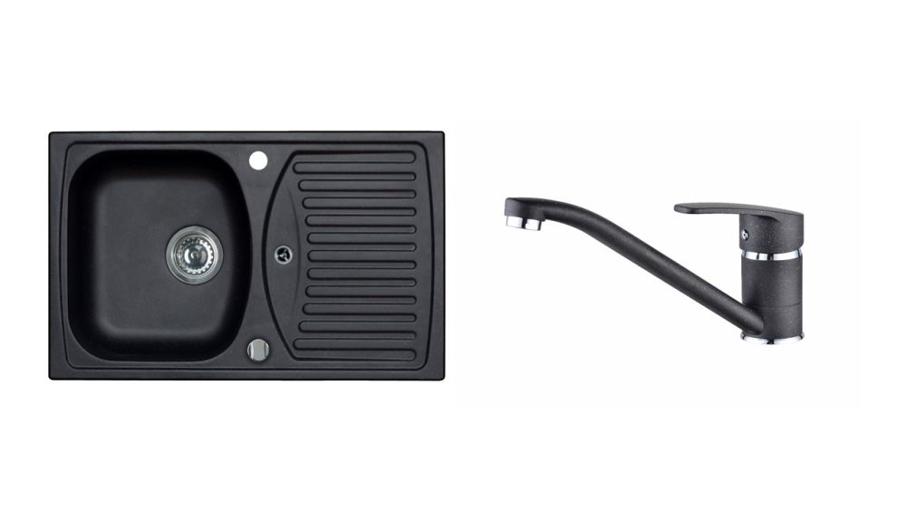 Vestavěný dřez, univerzál. Provedení : granitový dřez s odkapem Vnější rozměr: 780 x 480 mm Rozměr vaničky: 359 x 399 x 160 mm Exentrický sítkový ventil 3 1/2 s přepadem, sifon pro úsporu místa s odbočkou na myčku Úchyty a těsnění pro upevnění dřezu v balení S otvorem pro baterii Návod pro instalaci v obrázcích na obale Instalace do skříňky o šířce 500 mm Váha: 12,25 kg Rozměr balení (mm): 865x560x230 Baterie NINA Vysokotlaká baterie otočné ramínko rozměr:237 x 111 mm provedení: barevný nástřik