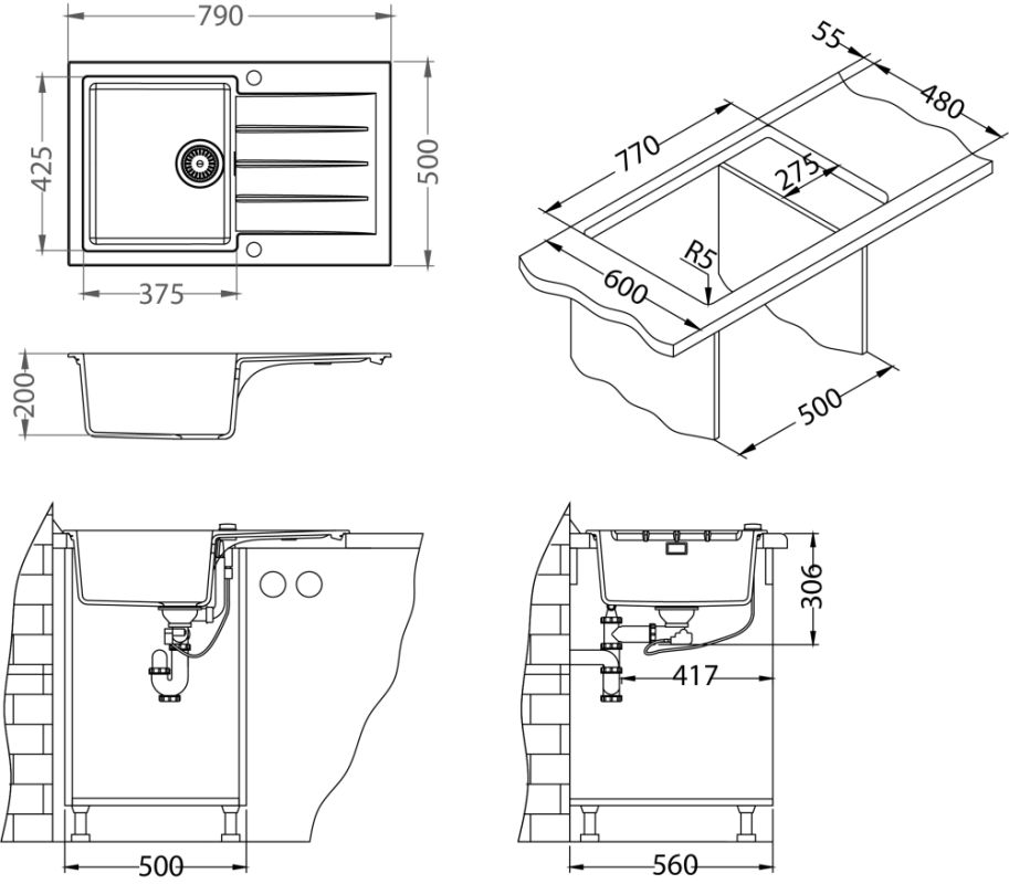 Vestavěný dřez, univerzál. Provedení : granitový dřez s odkapem Vnější rozměr: 790 x 500 mm Rozměr vaničky: 375 x 425 x 200 mm Excentrický sítkový ventil 3 1/2 s přepadem, sifon pro úsporu místa s odbočkou na myčku Úchyty a těsnění pro upevnění dřezu v balení S otvorem pro baterii Návod pro instalaci v obrázcích na obale Instalace do skříňky o šířce 500 mm Váha: 14 kg Rozměr balení (mm): 904x598x263 Baterie Ruta Chrom Stojánková baterie Otočné ramínko Rozměr: 215x328 mm Provední chrom