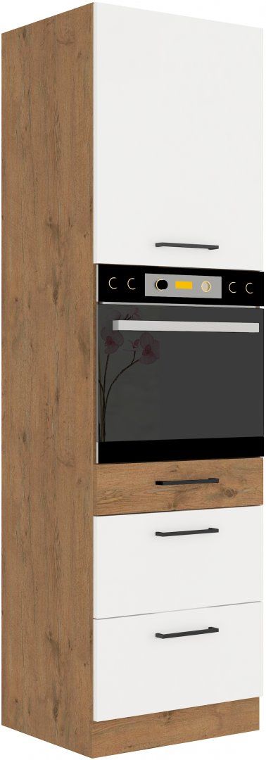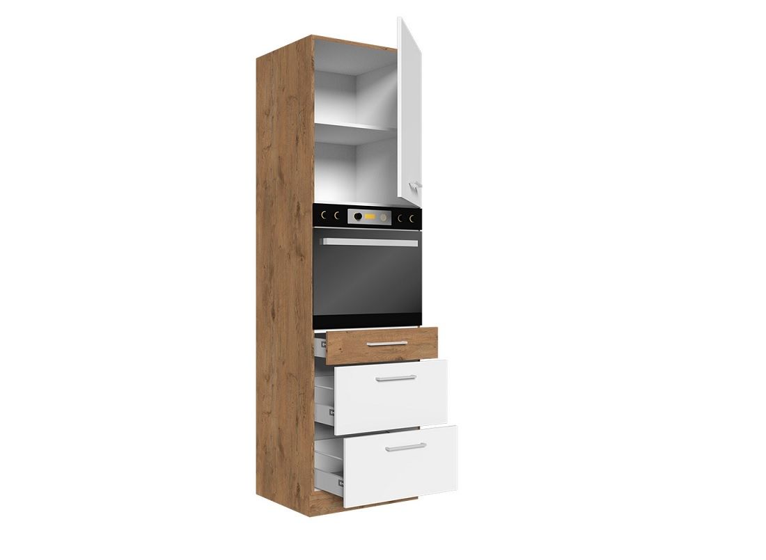 Vysoká skříň na vestavnou troubu ze systému VIGGO BÍLÁ - skříňka do kuchyňské linky je opatřena prostorem na vestavnou troubu, třemi výsuvnými šuplíky a otevíracími dvířky se širokými úchyty. Dvířka skříněk jsou provedené v moderním bílém lesku v kombinaci s dubem Lancelot.