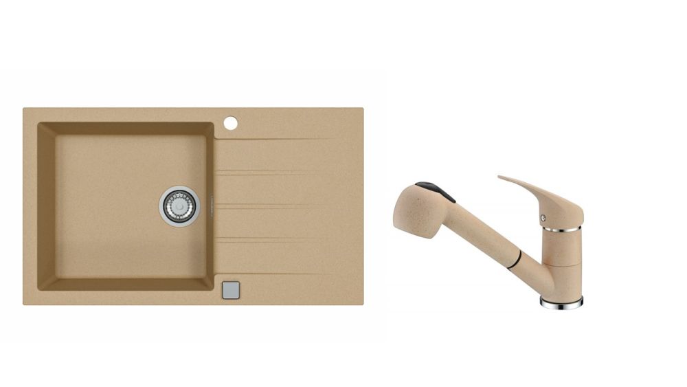 Vestavěný dřez, univerzál. Provedení : granitový dřez s odkapem Vnější rozměr: 860 x 500 mm Rozměr vaničky: 445 x 425 x 200 mm Excentrický sítkový ventil 3 1/2 s přepadem, sifon pro úsporu místa s odbočkou na myčku Úchyty a těsnění pro upevnění dřezu v balení S otvorem pro baterii Návod pro instalaci v obrázcích na obale Instalace do skříňky o šířce 600 mm Váha: 15,2 kg Rozměr balení (mm): 974x598x263 Baterie AM 20 Vysokotlaká baterie otočné ramínko vytahovací sprška rozměr:198 x 150 mm provedení: barevný nástřik