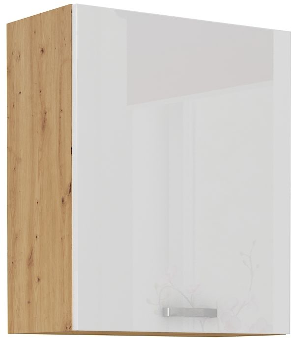 Horní otevírací skříňka ze systému ARTTISAN BÍLÁ - skříňka do kuchyňské linky je uzavíratelná praktickými dvířky se širokým kovovým úchytem. Dvířka skříněk jsou provedené v moderním bílého lesku v kombinaci s dubem Artisan.