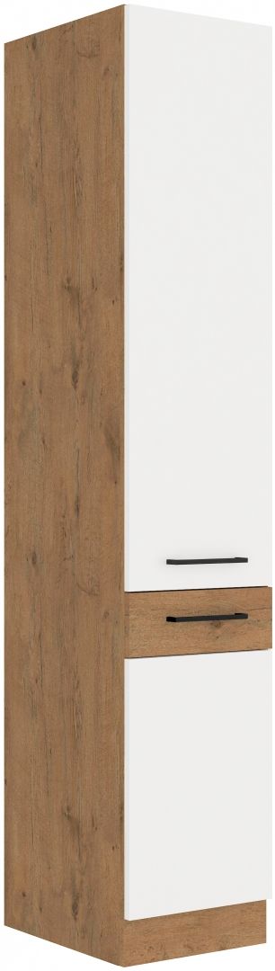 Vysoká potravinová skříň ze systému VIGGO BÍLÁ - skříňka do kuchyňské linky je opatřena dvěma prostory s policemi a otevíracími dvířky se širokými úchyty. Dvířka skříněk jsou provedené v moderním bílém lesku v kombinaci s dubem Lancelot.