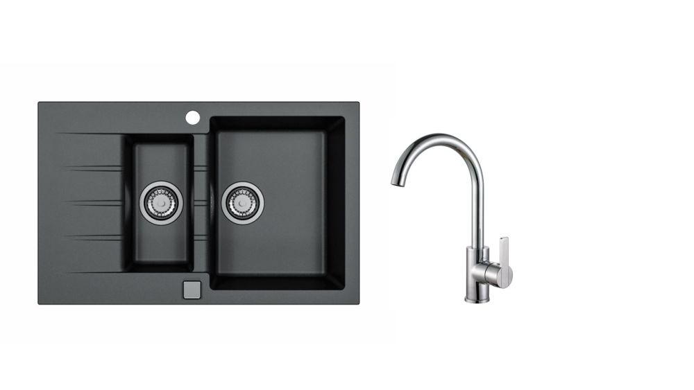 Vestavěný dřez, univerzál. Provedení : granitový dřez s odkapem Vnější rozměr: 790 x 500 mm Rozměr vaničky: 330 x 425 x 200 mm Rozměr vaničky: 170 x 340 x 140 mm Exentrický sítkový ventil 3 1/2 s přepadem, sifon pro úsporu místa s odbočkou na myčku Úchyty a těsnění pro upevnění dřezu v balení S otvorem pro baterii Návod pro instalaci v obrázcích na obale Instalace do skříňky o šířce 600 mm Váha: 15,6 kg Rozměry balení (mm): 904x598x263 Baterie Tonia Chrom Materiál: CHROM Vysokotlaká, otočná Rozměry: 174x320 mm Váha: 1,15 Kg