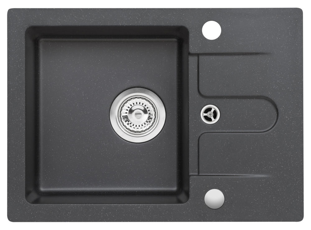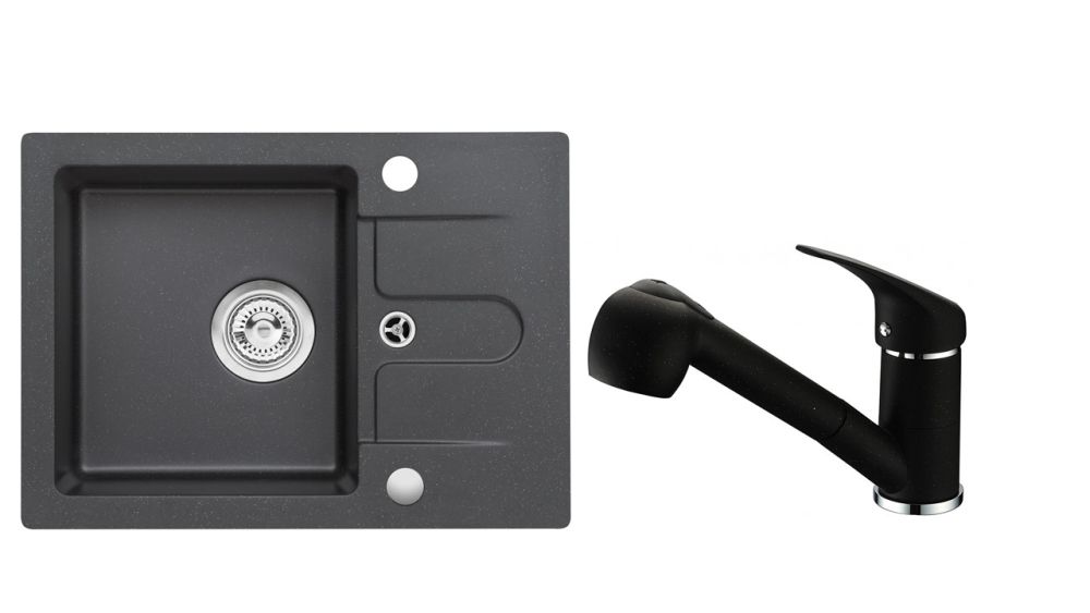 Vestavěný dřez, UNIVERZÁL Provedení : granitový dřez Vnější rozměr: 580x420 mm Rozměr vaničky: 320x348x140 mm Odtoková souprava s přepadem a 3 1/2 + manuální sifon S otvorem pro baterii Návod pro instalaci v obrázcích na obale Instalace do skříňky o šířce 500 mm Baterie AM 20 Vysokotlaká baterie otočné ramínko vytahovací sprška rozměr:198 x 150 mm provedení: barevný nástřik