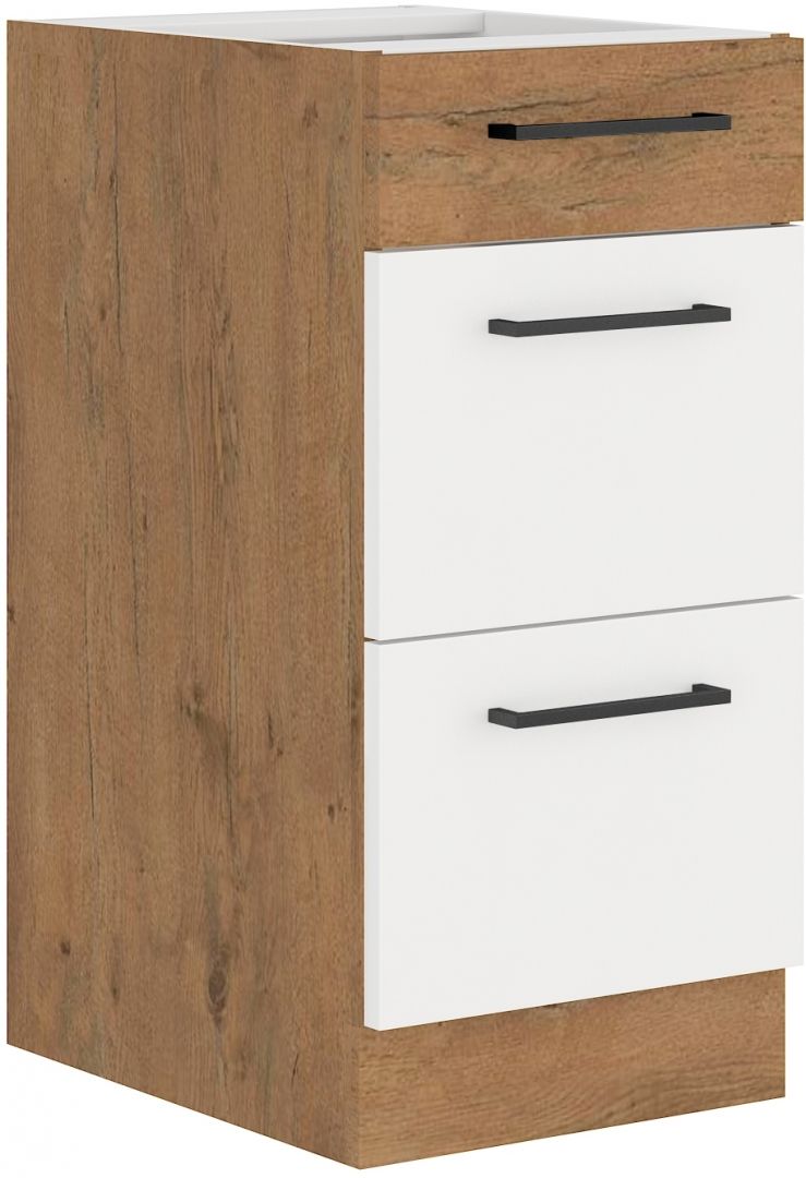 Spodní zásuvková skříňka ze systému VIGGO BÍLÁ - skříňka do kuchyňské linky je opatřena třemi výsuvnými šuplíky se širokými úchyty. Dvířka skříněk jsou provedené v moderním bílém lesku v kombinaci s dubem Lancelot.