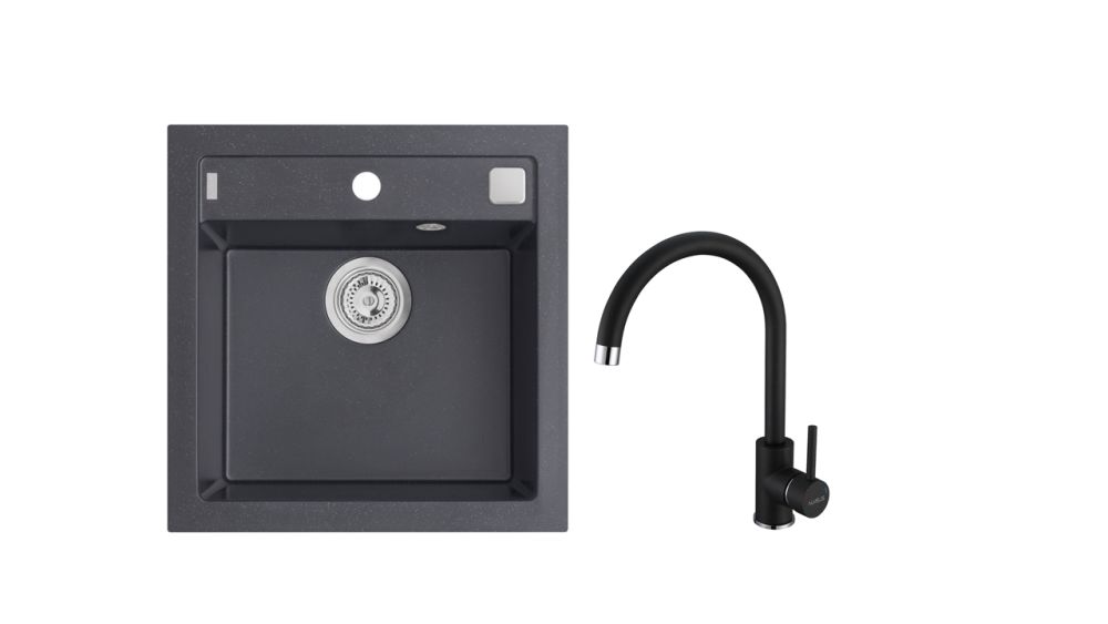 Vestavěný nebo dřez se spodní montáží, univerzál. Provedení : granitový dřez Vnější rozměr: 520x510 mm Rozměr vaničky: 440x350x200 mm Excentrický sítkový ventil 3 1/2 s přepadem, sifon pro úsporu místa s odbočkou na myčku. Úchyty a těsnění pro upevnění dřezu v balení S otvorem pro baterii Předfrézovaný třetí otvor pro dávkovač saponátů Návod pro instalaci v obrázcích na obale Instalace do skříňky o šířce u montáže I: 500 mm U: 600 mm Váha: 12,7 kg Rozměr balení (mm): 695x560x267 Vysokotlaká baterie Otočné ramínko Provedení: barevný nástřik Rozměr: 216 x 351 mm