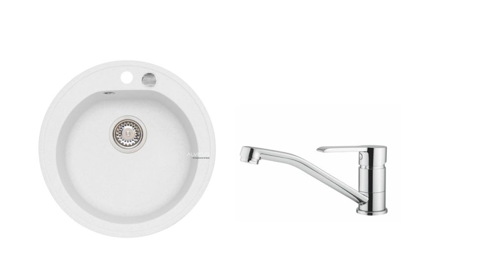 Vestavěný dřez, univerzál. Provedení : granitový dřez s odkapem Vnější rozměr: průměr 510 mm Rozměr vaničky: průměr 400 x 175 mm Exentrický sítkový ventil 3 1/2 s přepadem, sifon pro úsporu místa s odbočkou na myčku Úchyty a těsnění pro upevnění dřezu v balení S otvorem pro baterii Návod pro instalaci v obrázcích na obale Instalace do skříňky o šířce 500 mm Váha: 12,14 kg Rozměr balení (mm): 705x560x267 Baterie Ruta Stojánková baterie Otočné ramínko Rozměr: 215x328 mm Provedení chrom