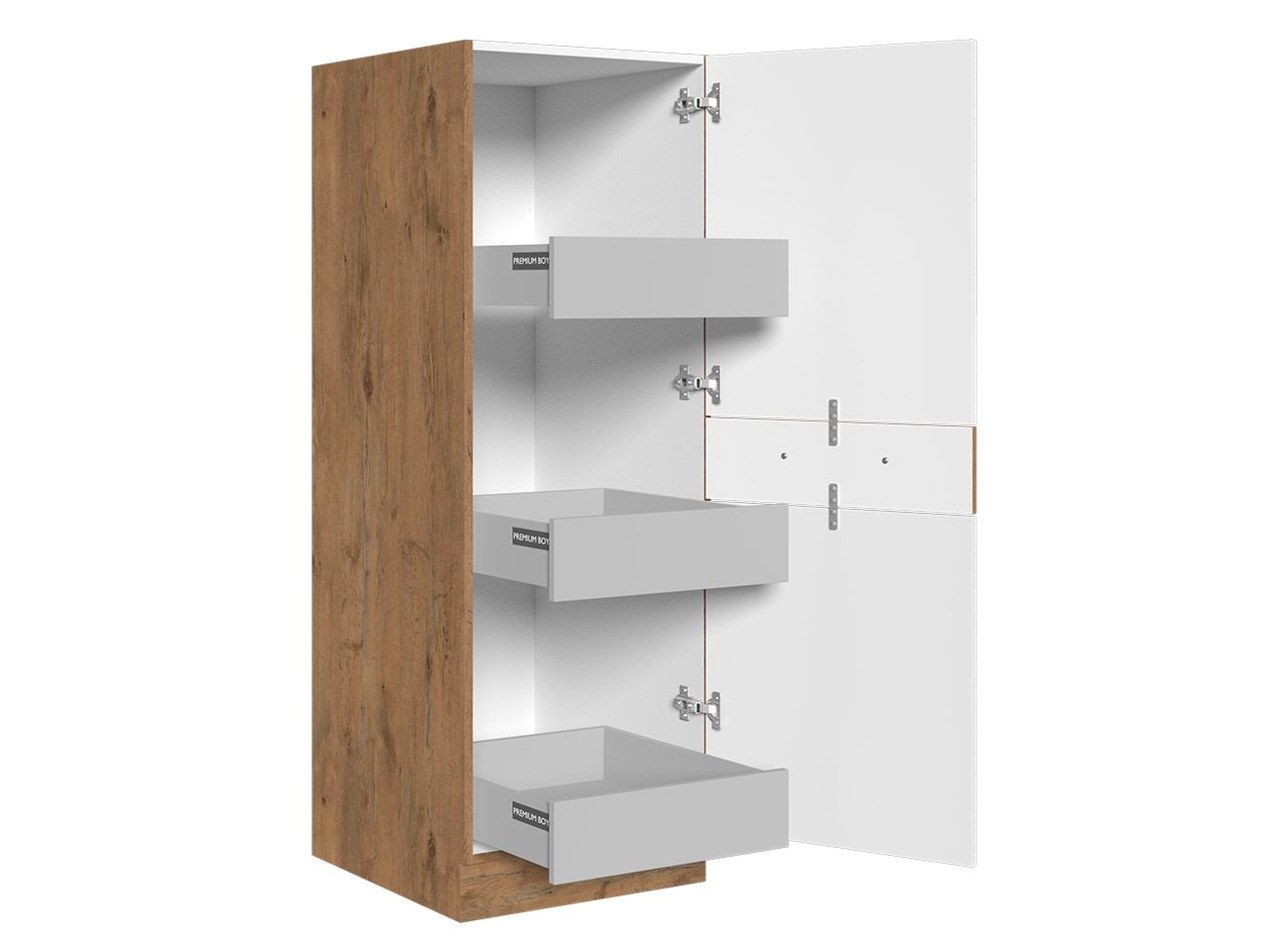 Potravinová skříň ze systému VIGGO BÍLÁ - skříňka do kuchyňské linky je opatřena třemi výsuvnými šuplíky a otevíracími dvířky se širokými úchyty. Dvířka skříněk jsou provedené v moderním bílém lesku v kombinaci s dubem Lancelot.