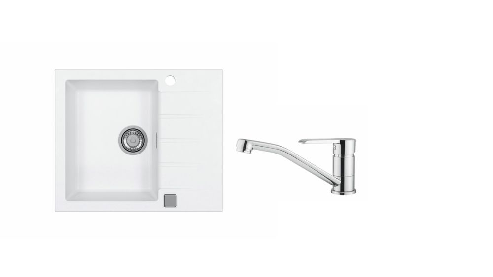 Vestavěný dřez, univerzál. Provedení : granitový dřez s odkapem Vnější rozměr: 590 x 500 mm Rozměr vaničky: 325 x 425 x 200 mm Exentrický sítkový ventil 3 1/2 s přepadem, sifon pro úsporu místa s odbočkou na myčku Úchyty a těsnění pro upevnění dřezu v balení S otvorem pro baterii Návod pro instalaci v obrázcích na obale Instalace do skříňky o šířce 450 mm Váha: 11,5 kg Rozměr balení (mm): 714x598x263 Baterie Ruta Stojánková baterie Otočné ramínko Rozměr: 215x328 mm Provedení chrom
