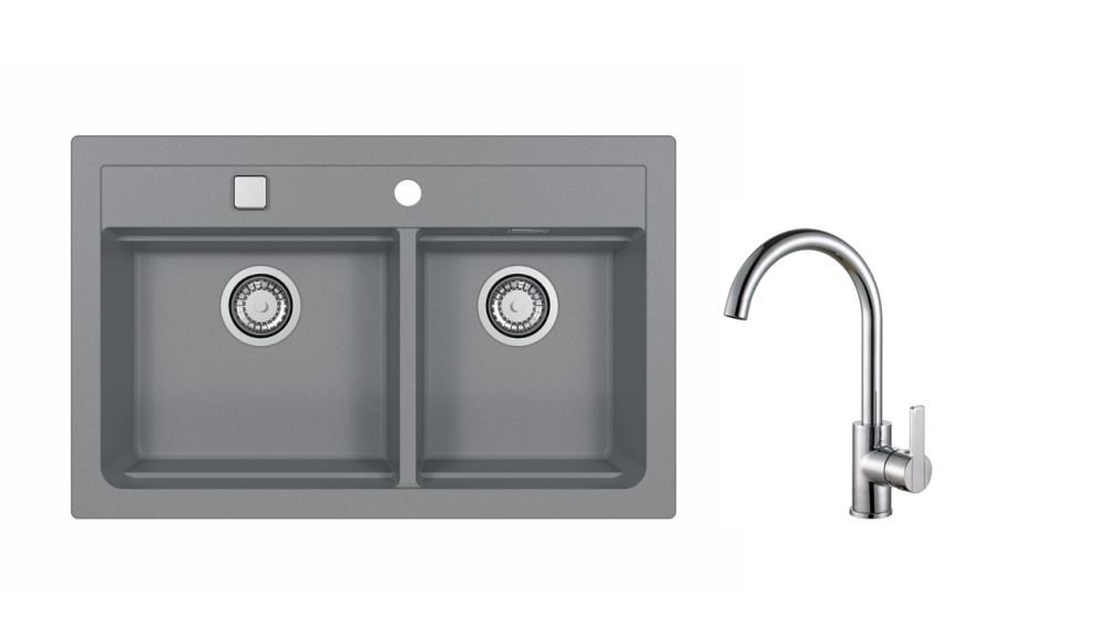 Vestavěný dřez, univerzál. Provedení : granitový dřez s odkapem Vnější rozměr: 790 x 500 mm Rozměr vaničky: 390 x 340 x 195 mm 300 x 340 x 145 mm Exentrický sítkový ventil 3 1/2 s přepadem, sifon pro úsporu místa s odbočkou na myčku Úchyty a těsnění pro upevnění dřezu v balení S otvorem pro baterii Předfrézované tři otvory Návod pro instalaci v obrázcích na obale Instalace do skříňky při montáži: I- o šířce 800 mm, U- o šířce 900 mm Váha: 17,5 kg Rozměry balení (mm): 904x598x263 Baterie Tonia Chrom Materiál: CHROM Vysokotlaká, otočná Rozměry: 174x320 mm Váha: 1,15 Kg