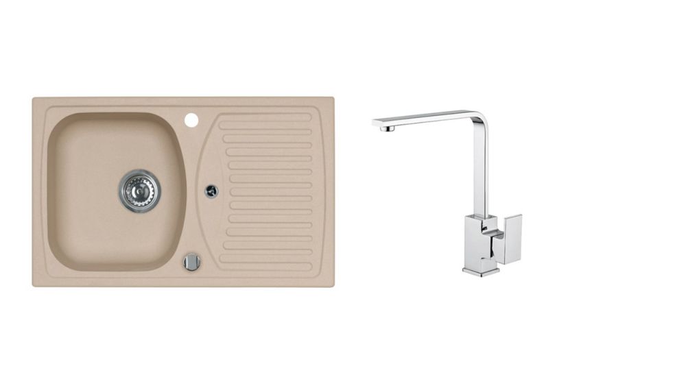 Vestavěný dřez, univerzál. Provedení : granitový dřez s odkapem Vnější rozměr: 780 x 480 mm Rozměr vaničky: 359 x 399 x 160 mm Exentrický sítkový ventil 3 1/2 s přepadem, sifon pro úsporu místa s odbočkou na myčku Úchyty a těsnění pro upevnění dřezu v balení S otvorem pro baterii Návod pro instalaci v obrázcích na obale Instalace do skříňky o šířce 500 mm Váha: 12,25 kg Rozměr balení (mm): 865x560x230 Baterie RENO Stojánková baterie Otočné ramínko Rozměr: 207x286 mm Provední chrom