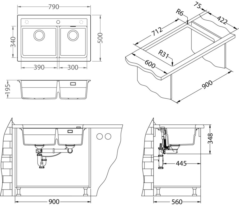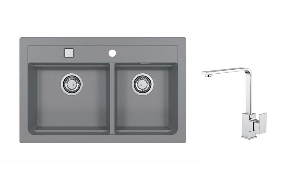 Vestavěný dřez, univerzál. Provedení : granitový dřez s odkapem Vnější rozměr: 790 x 500 mm Rozměr vaničky: 390 x 340 x 195 mm 300 x 340 x 145 mm Exentrický sítkový ventil 3 1/2 s přepadem, sifon pro úsporu místa s odbočkou na myčku Úchyty a těsnění pro upevnění dřezu v balení S otvorem pro baterii Předfrézované tři otvory Návod pro instalaci v obrázcích na obale Instalace do skříňky při montáži: I- o šířce 800 mm, U- o šířce 900 mm Váha: 17,5 kg Rozměry balení (mm): 904x598x263 Baterie Reno Stojánková baterie Otočné ramínko Rozměr: 207x286 mm Provedení chrom