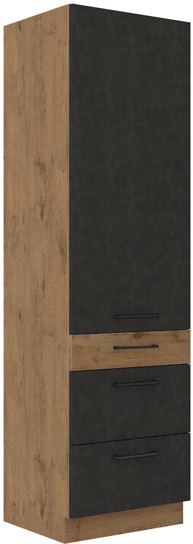 Vysoká skříň se zásuvkami ze systému VIGGO MATERA - skříňka do kuchyňské linky je opatřena třemi výsuvnými šuplíky a otevíracími dvířky se širokými úchyty. Dvířka skříněk jsou provedené v moderním matném dekoru Matera v kombinaci s dubem Lancelot.