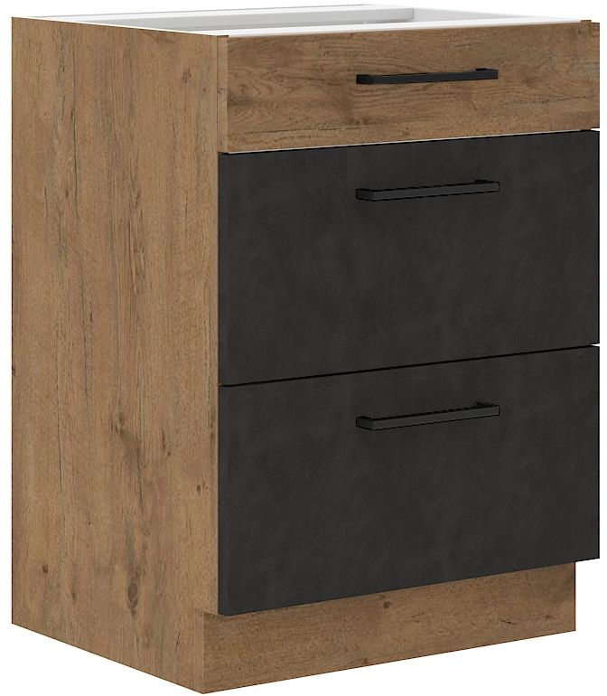 Spodní zásuvková skříňka ze systému VIGGO MATERA - skříňka do kuchyňské linky je opatřena třemi výsuvnými šuplíky se širokými úchyty. Dvířka skříněk jsou provedené v moderním dekoru Matera mat v kombinaci s dubem Lancelot.