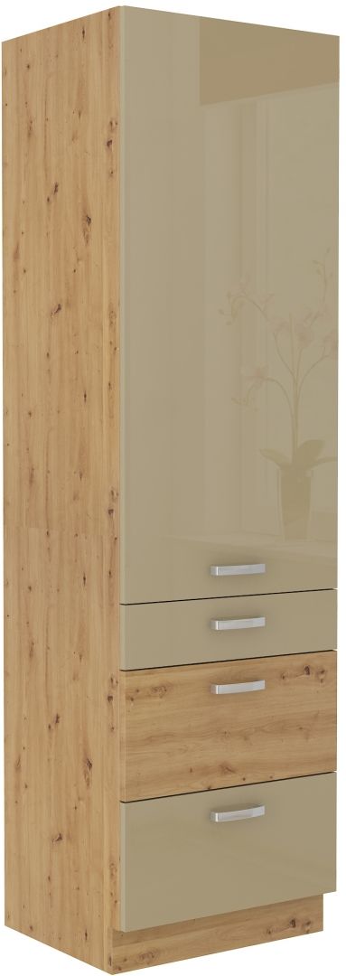 Vysoká skříň se zásuvkami ze systému ARTTISAN CAPPUCINO - skříňka do kuchyňské linky je opatřena třemi výsuvnými šuplíky a otevíracími dvířky se širokými úchyty. Dvířka skříněk jsou provedené v moderním cappucino lesku v kombinaci s dubem Artisan.