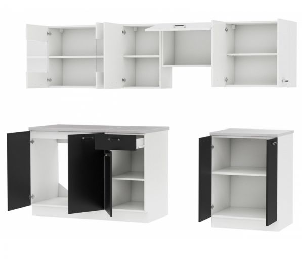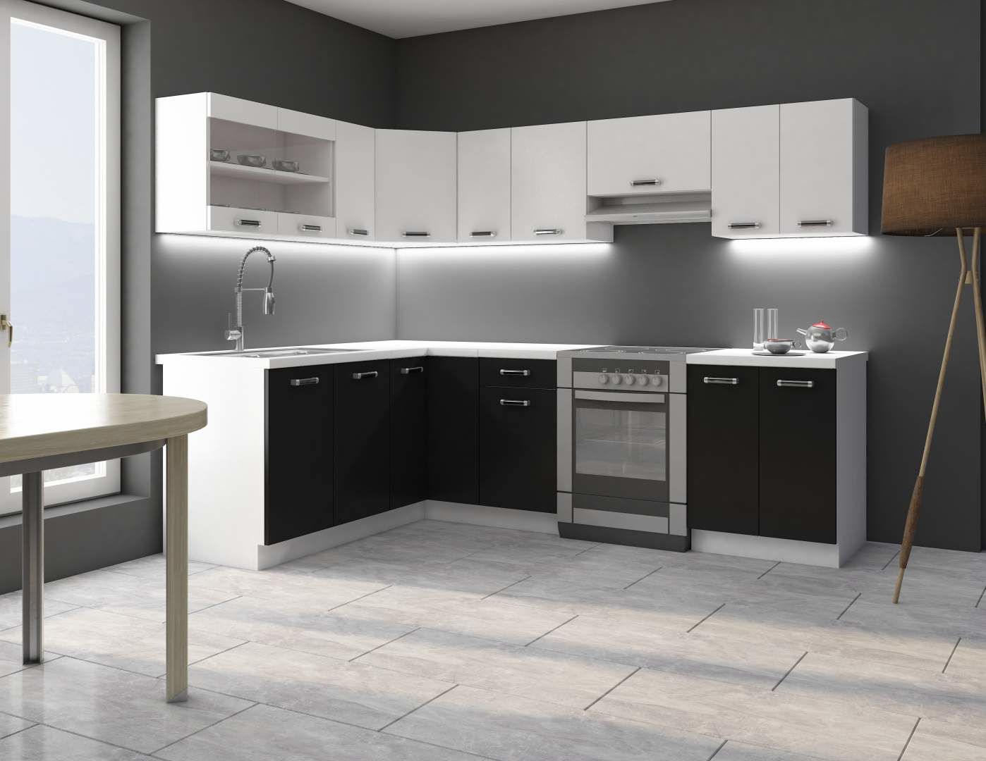 Moderní kuchyňská linka v barevném provedení korpus bílá + dvířka bílá / černá. Kuchyňská linka má atraktivní moderní vzhled je tak ideální volbou pro Vaši kuchyni. U skříněk s výklopem se dvířka zvedají pomocí plynových pístů. V ceně kuchyňské linky jsou plastové úchyty.