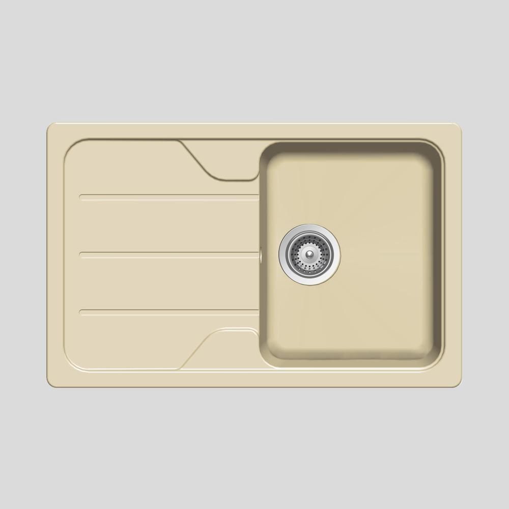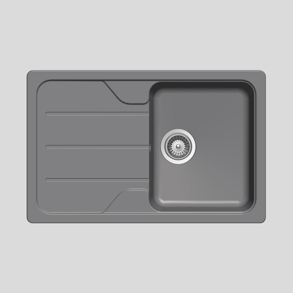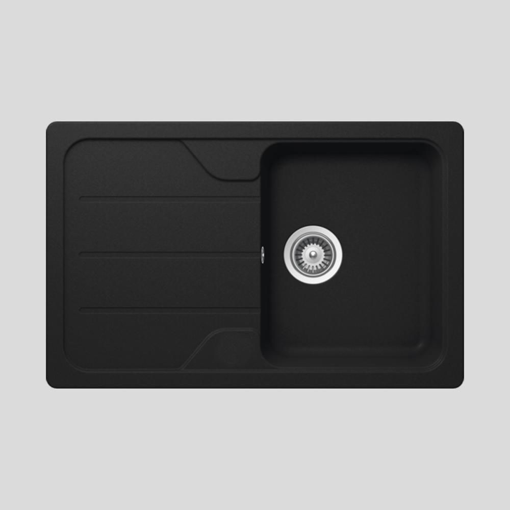 Granitový dřez v odkapovou plochou bez otvoru na baterii. Otvory na baterii jsou před chystané o standardním průměru 35 mm. Dřez je oboustranný, lze umístit dřezovou nádobu vpravo i vlevo. Minimální šířka skříňky pro osazení dřezu je š. 45 cm. Obsahuje sifon bez excentru.