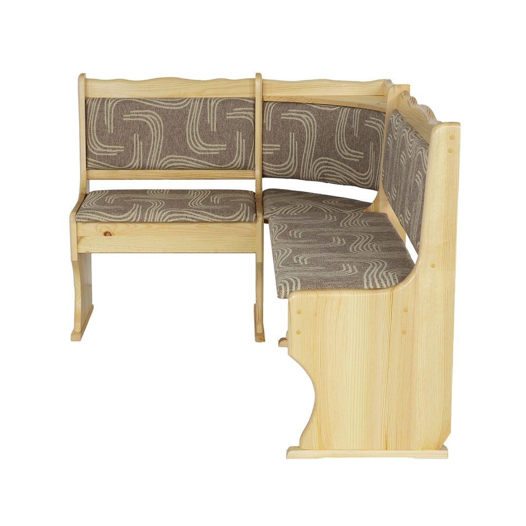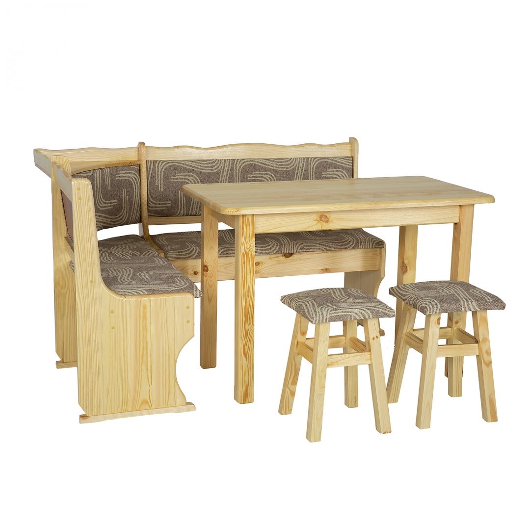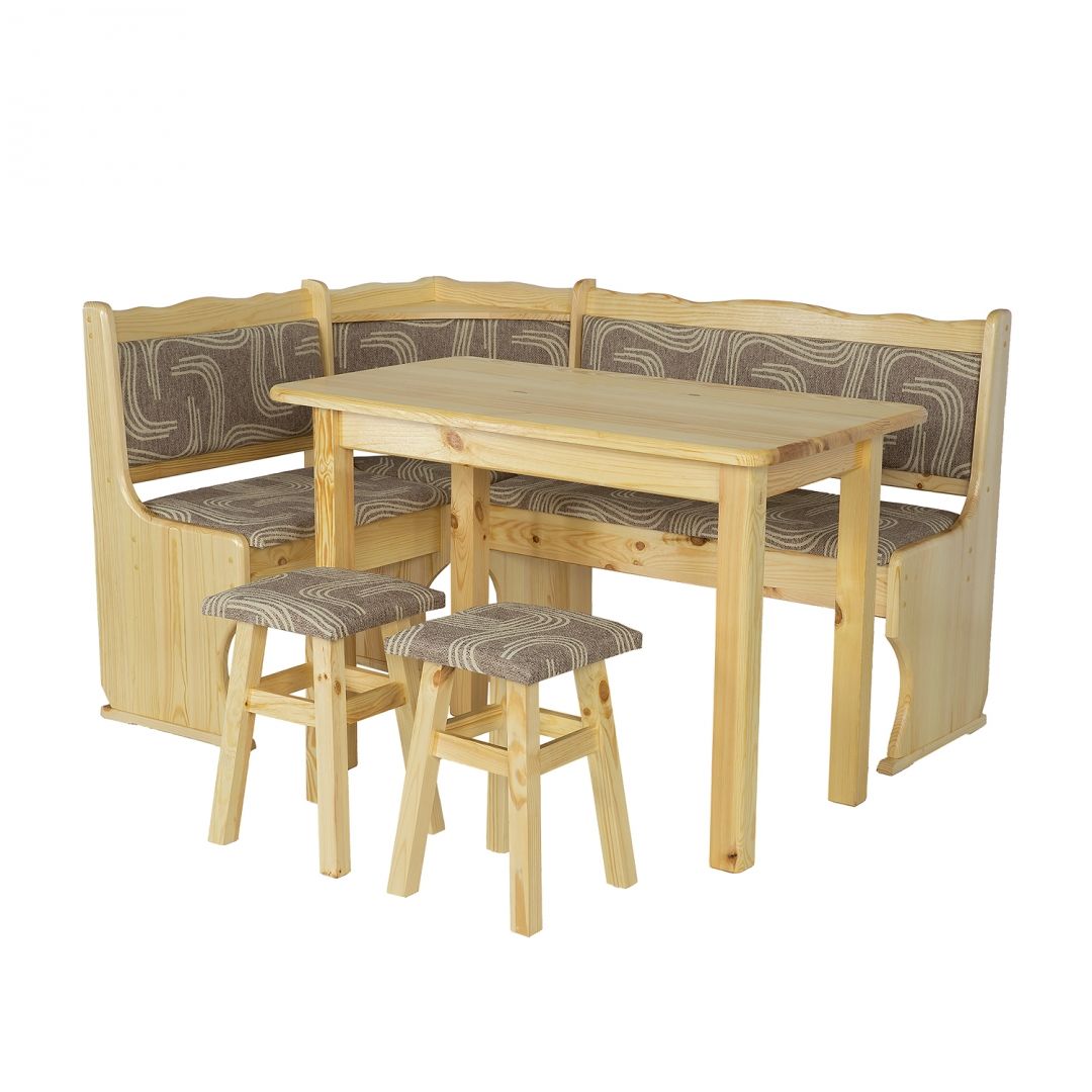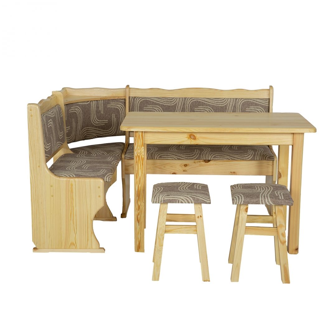 Klasická rohová jídelní lavice je vyrobena z kvalitního borovicového dřeva, které dodává mu pevnost, stabilitu a dlouhou životnost. Lavice je povrchově ošetřena několikavrstvým ekologickým a zdravotně nezávadným lakem. Sedací část a opěráky jsou pro větší pohodlí polstrované a čalouněné kvalitní potahovou látkou v několika barevných odstínech. K rohové jídelní lavici náleží také stůl a židle ze stejné kolekce.