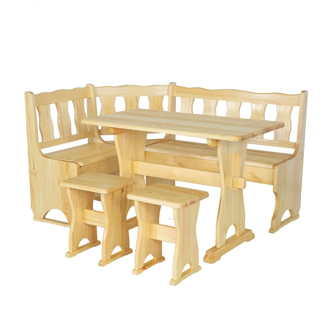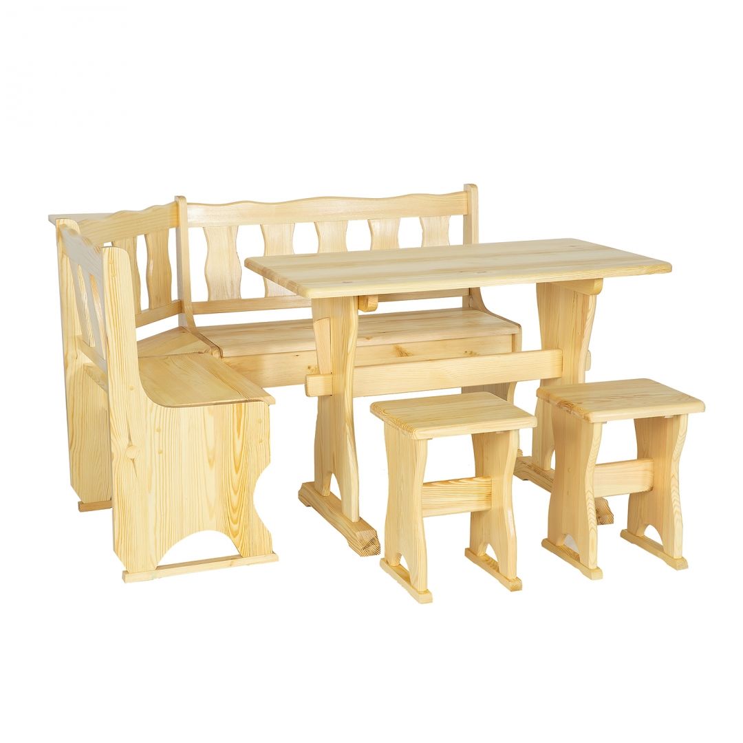 Klasická rohová jídelní souprava s lavicí, stolem a dvěmi stoličkami. Jídelní souprava je vyrobena z kvalitního borovicového dřeva, které dodává mu pevnost, stabilitu a dlouhou životnost. Tato jídlení rohová souprava je povrchově ošetřena několikavrstvým ekologickým a zdravotně nezávadným lakem.