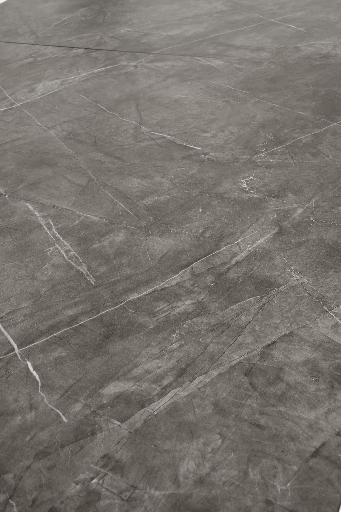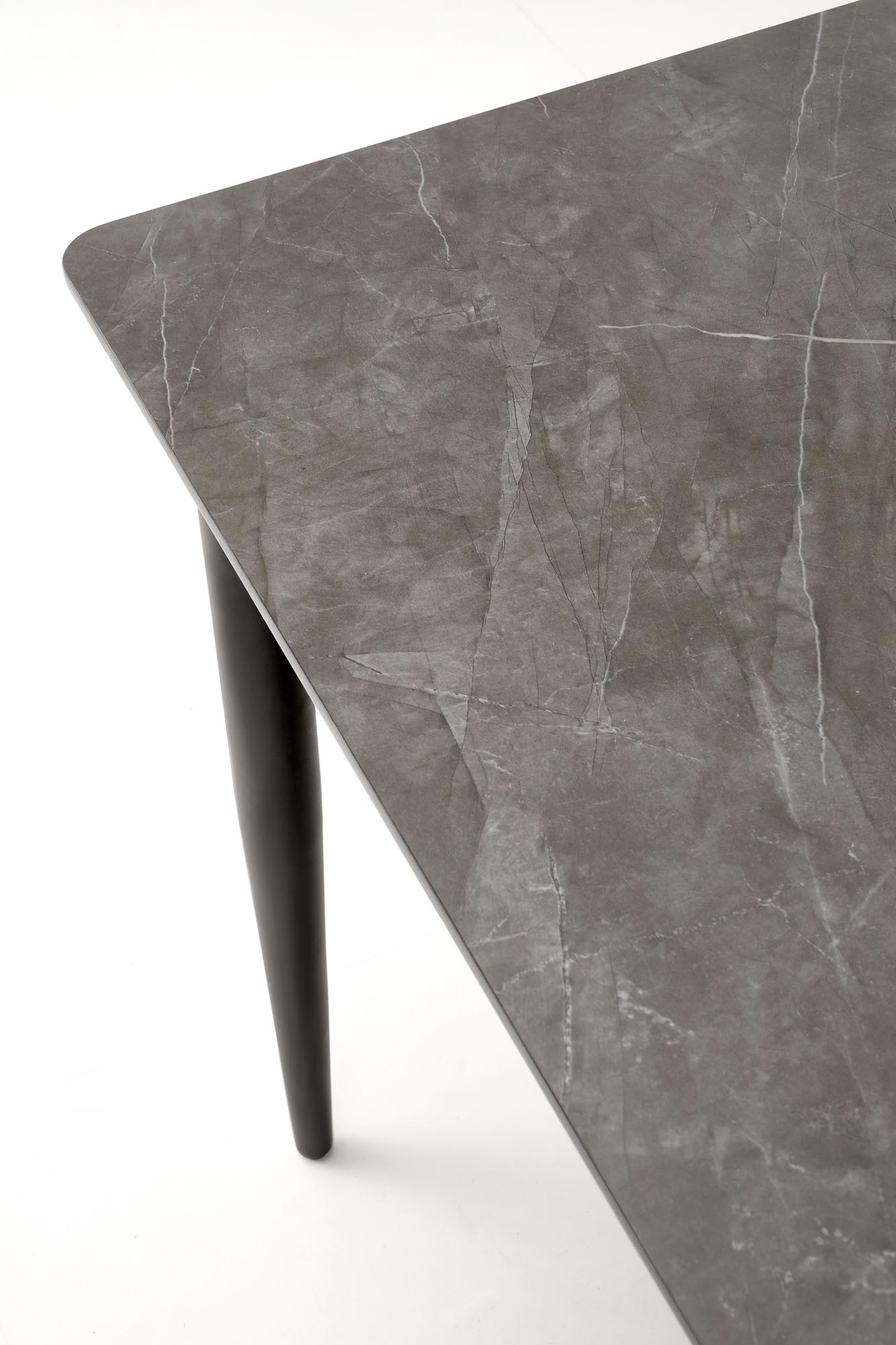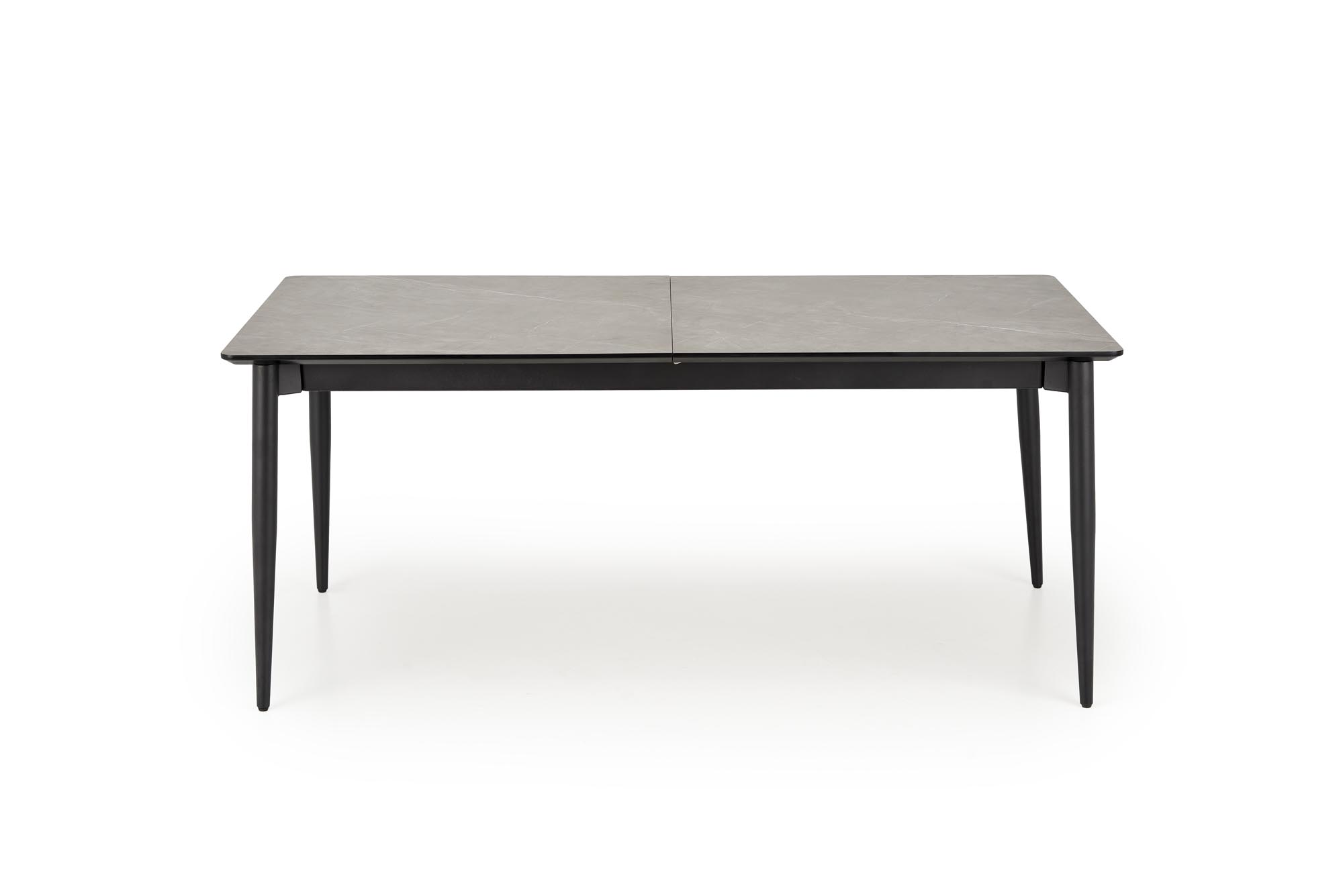 Jídelní stůl CHARLES - je moderní rozkládací jídelní stůl v kombinaci dýhované MDF desky v dekoru popelavého mramoru a černé práškované ocelové podnože.