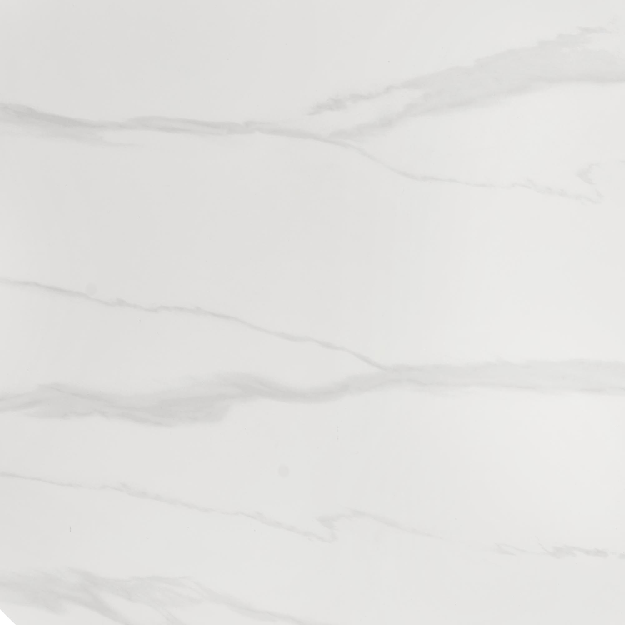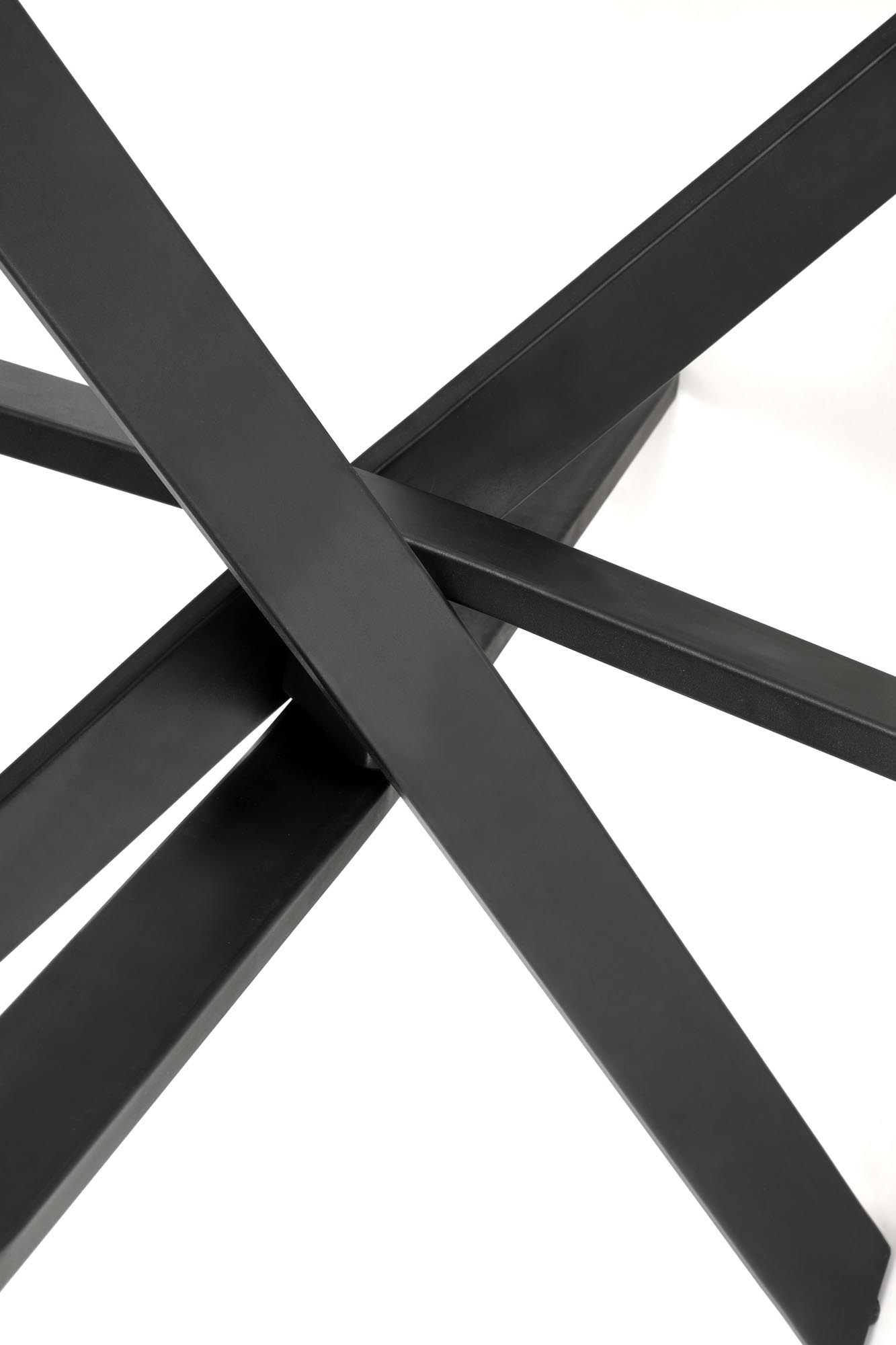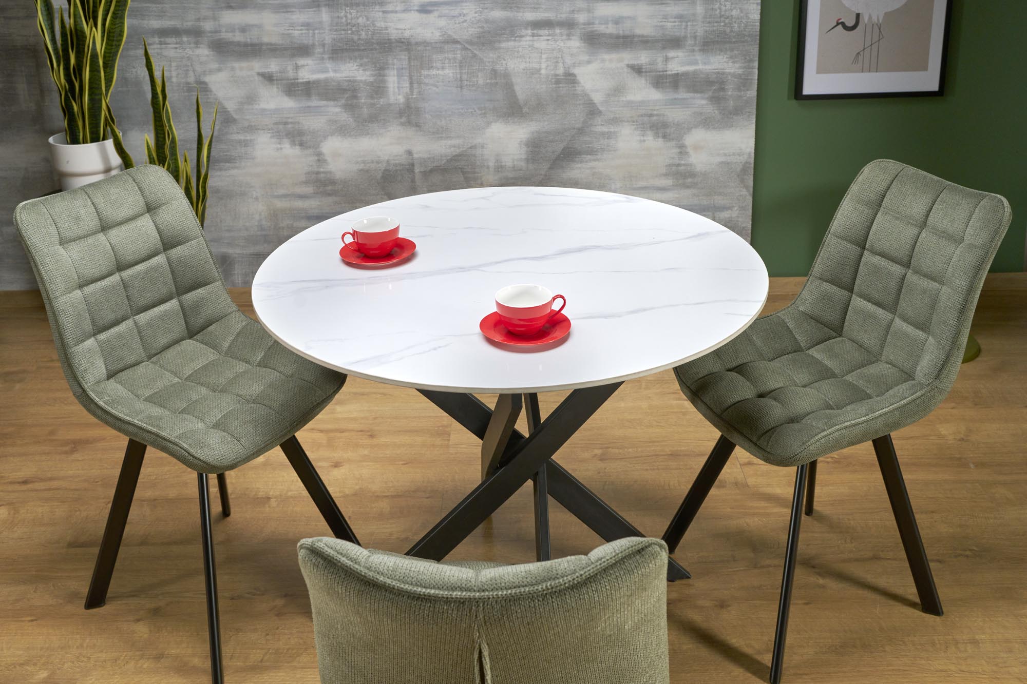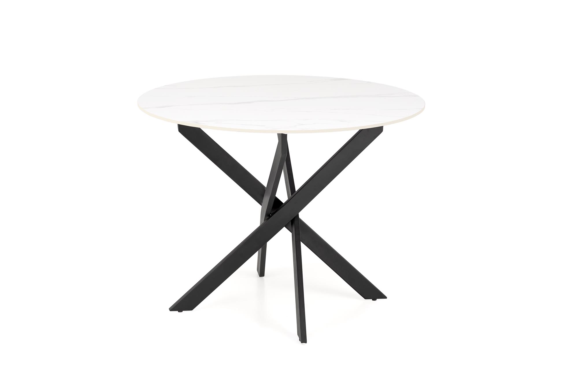 Jídelní stůl EDGAR 2 - je moderní kulatý jídelní stůl vyroben ze slinutého kamene v dekoru bílého mramoru a práškově lakované černé podnože.
