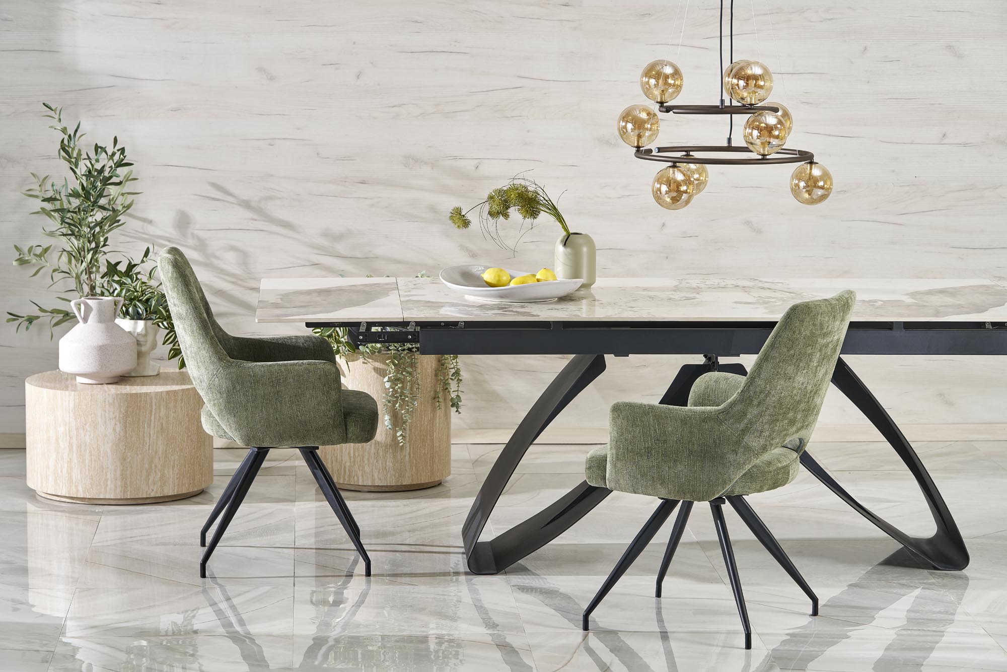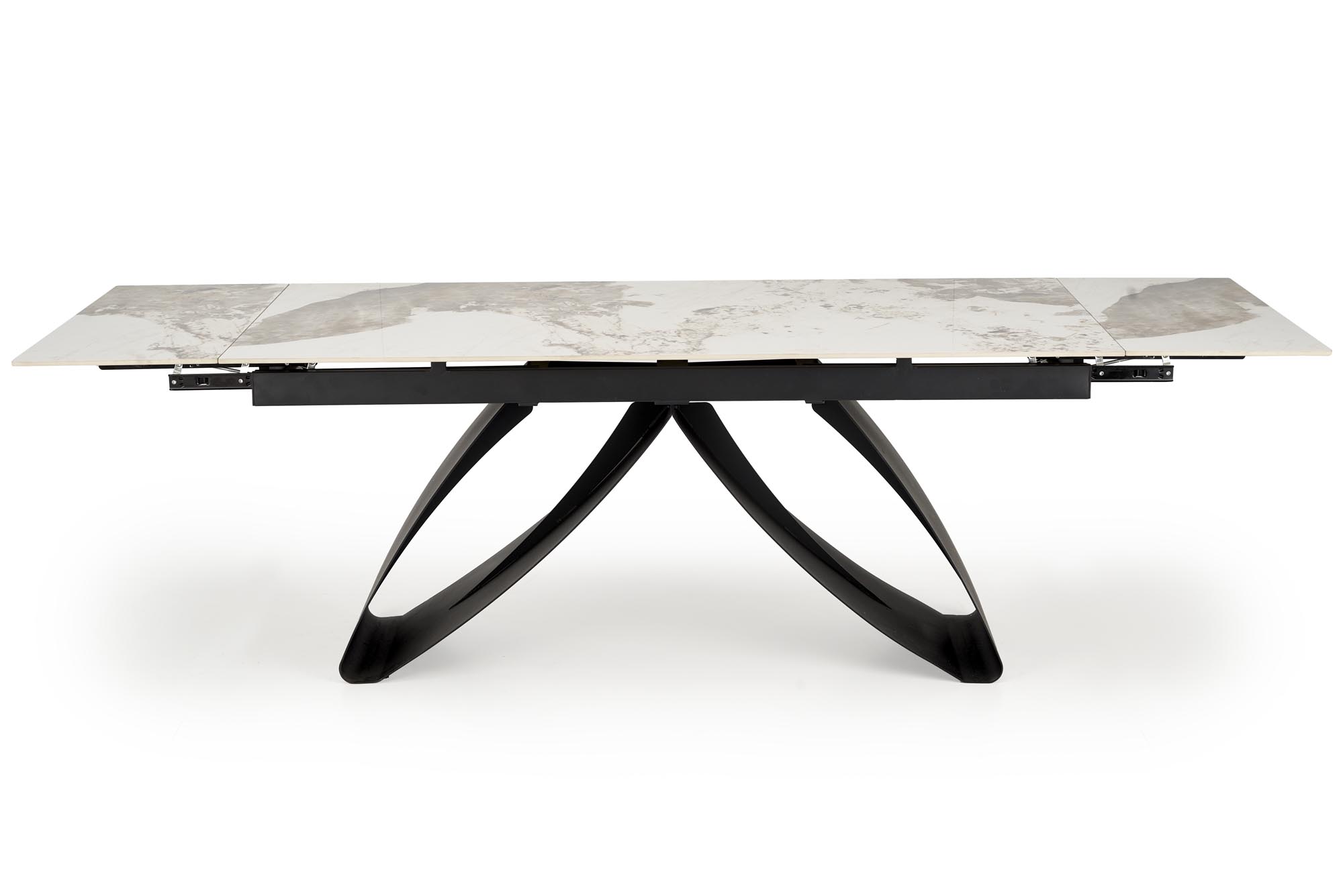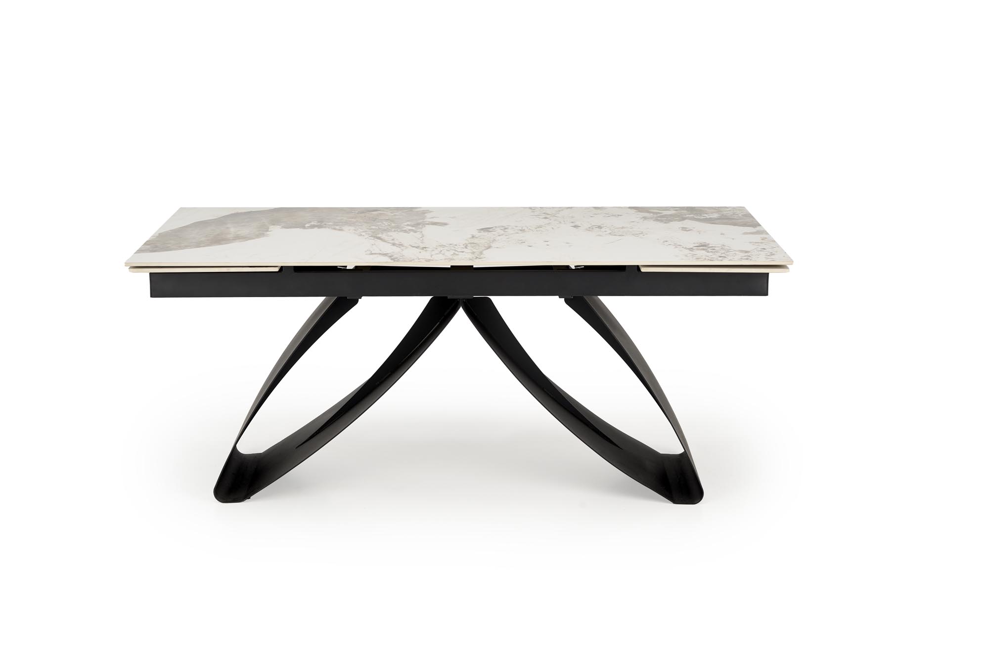 Jídelní stůl HILARIO - je robustní rozkládací stůl vyroben ze slinutého kamene v barvě béžového mramoru s moderní podnoží z černě lakované práškové oceli.