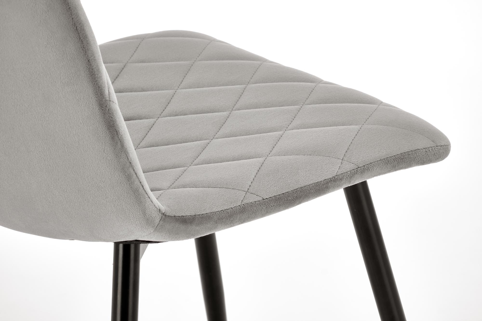 Jídelní židle K525 - je pohodlná a elegantní židle s kosočtvercovým prošíváním vyrobena v kombinaci lakované oceli a pohodlného sedáku a opěráku čalouněným sametovou látkou v šedé barvě.