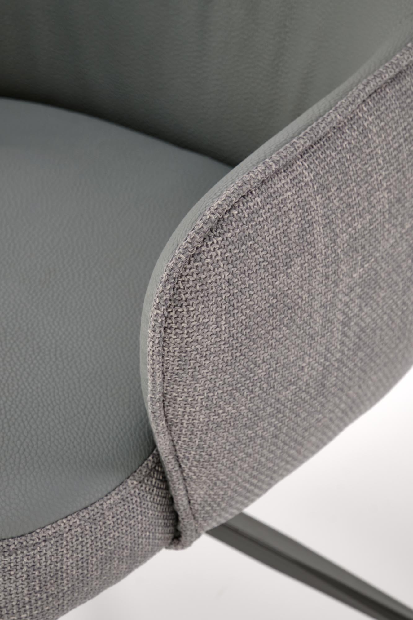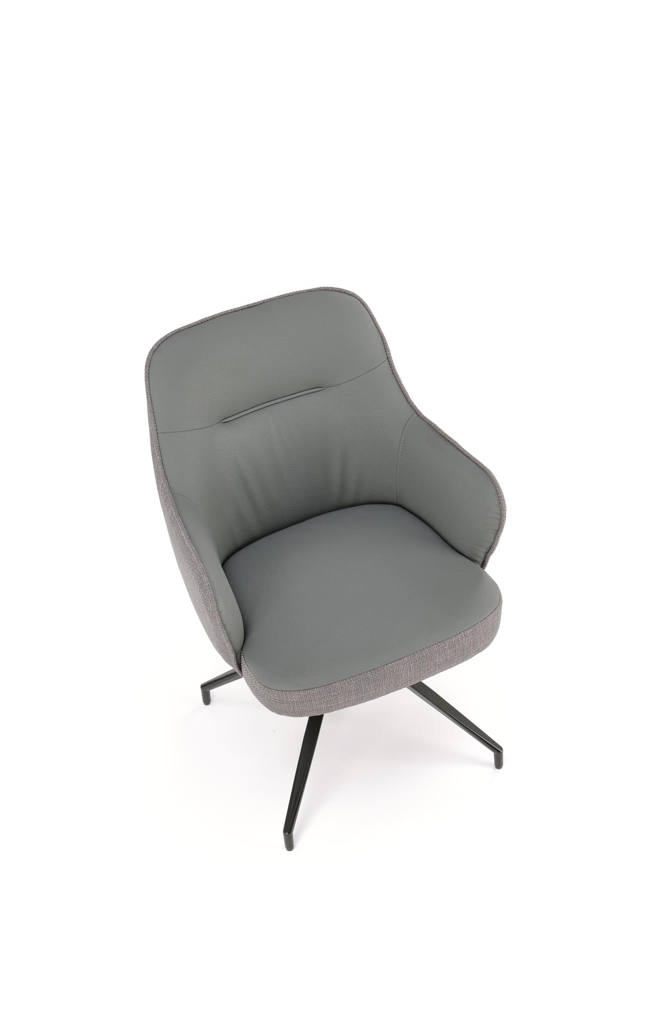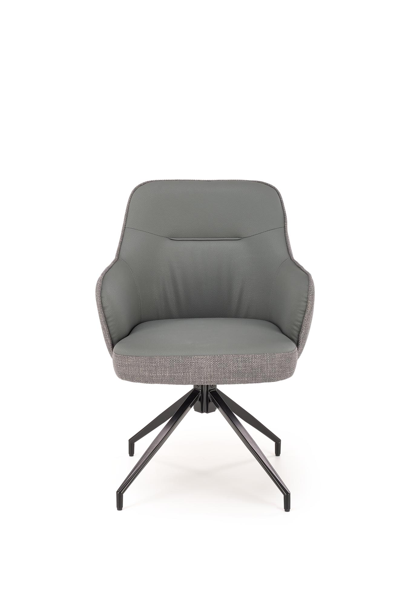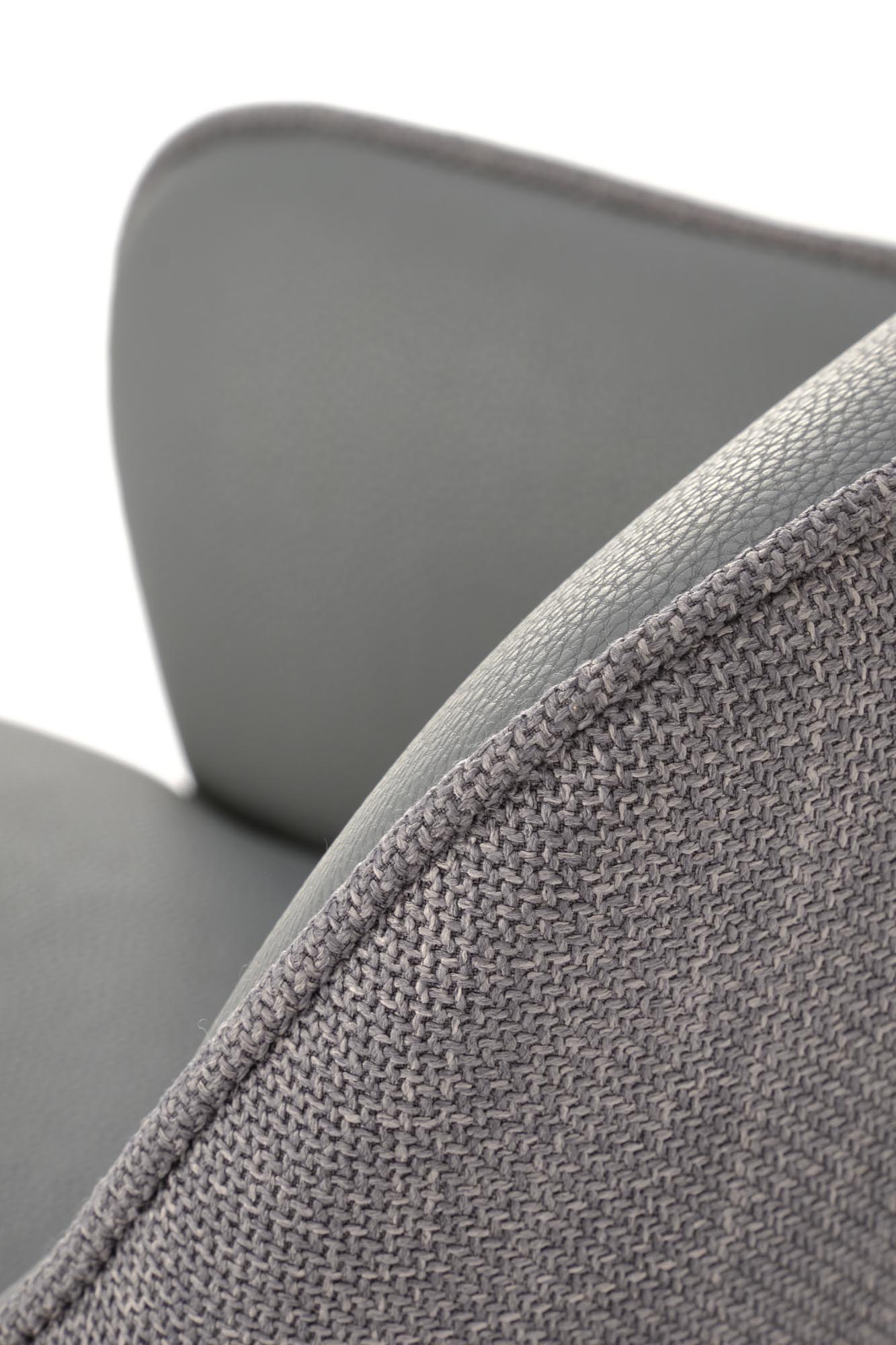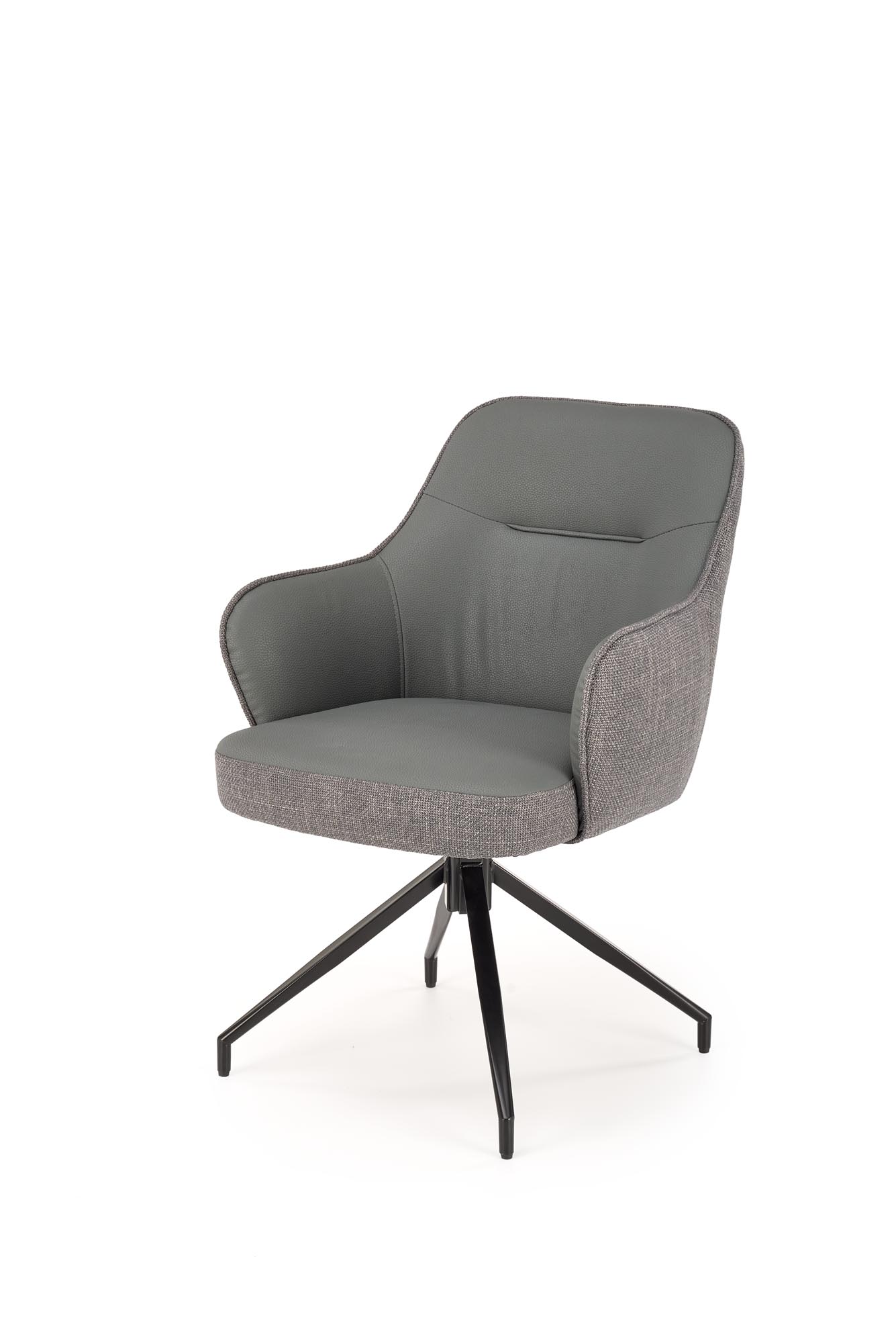 Jídelní židle K527 - je elegantní otočná židle vyrobena v kombinaci lakované oceli v černé barvě a pohodlného čalouněného sedáku v šedé barvě. Opěradlo a sedadlo je potaženo eco kůží, vnější strana kvalitní látkou. Otočný mechanismus nabízí funkci 180 stupňů.