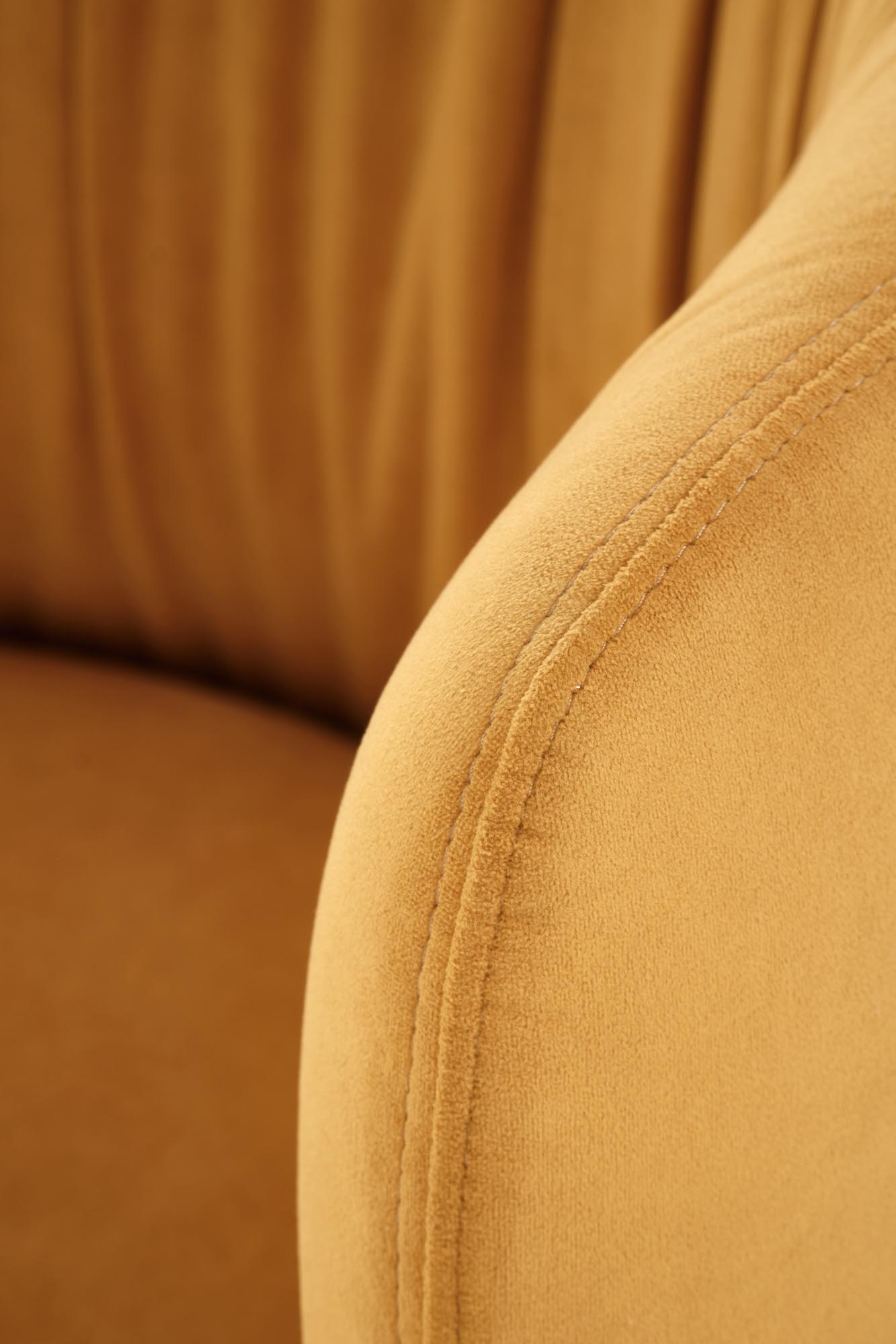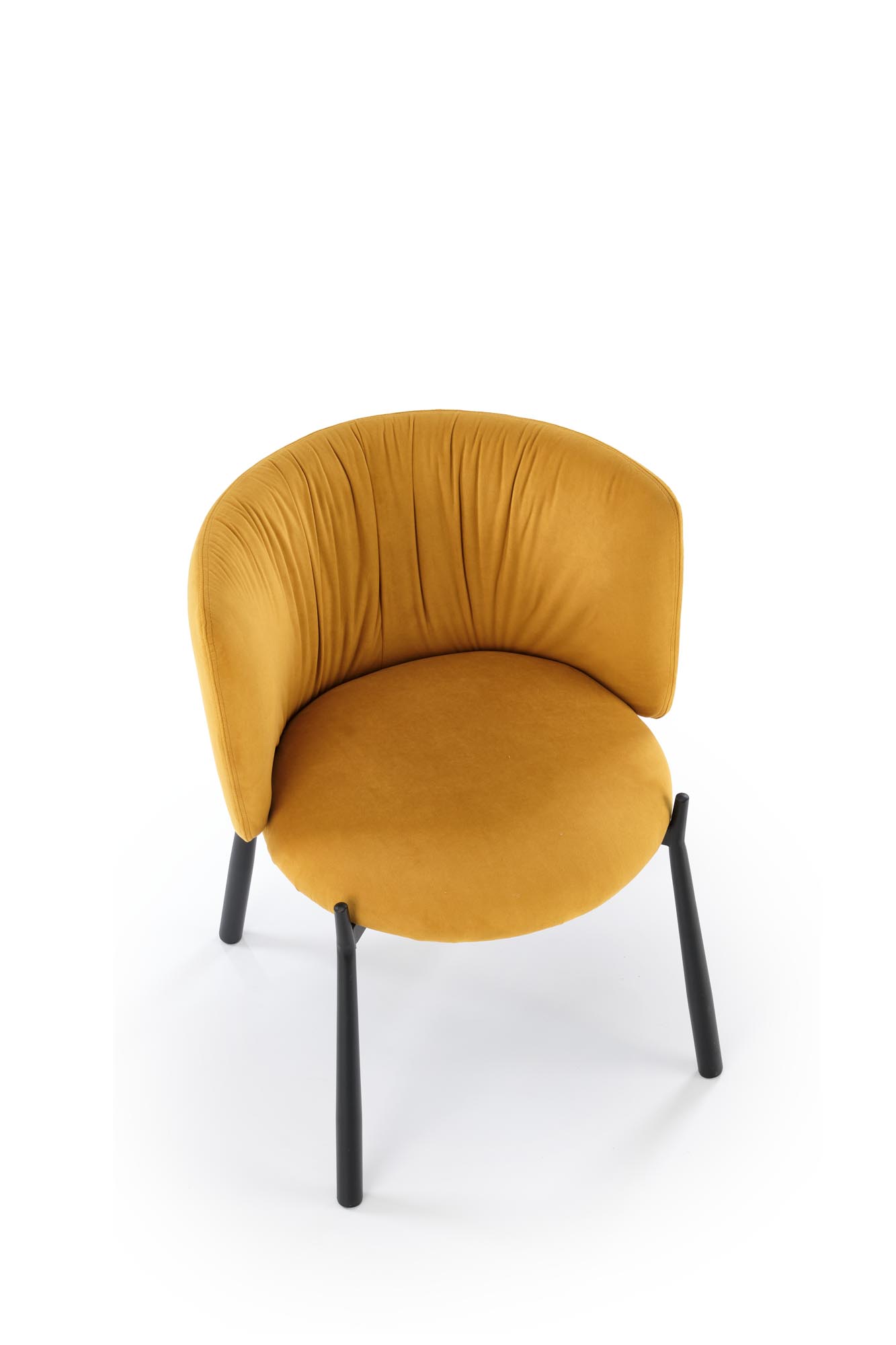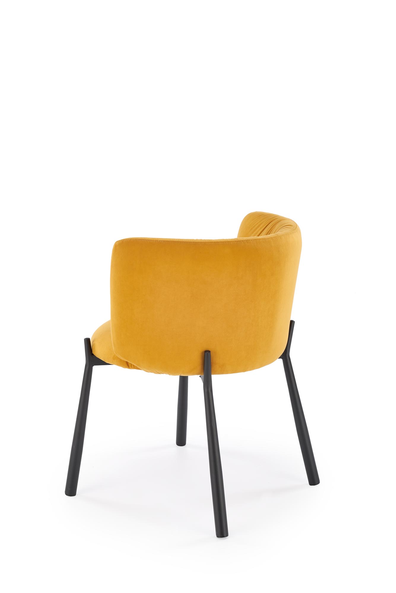 Jídelní židle K531 - je netypicky tvarovaná moderní židle vyrobena v kombinaci lakované oceli v černé barvě a pohodlného sedáku a opěráku čalouněným sametovou látkou MAVEL 68 v hořčicové barvě.
